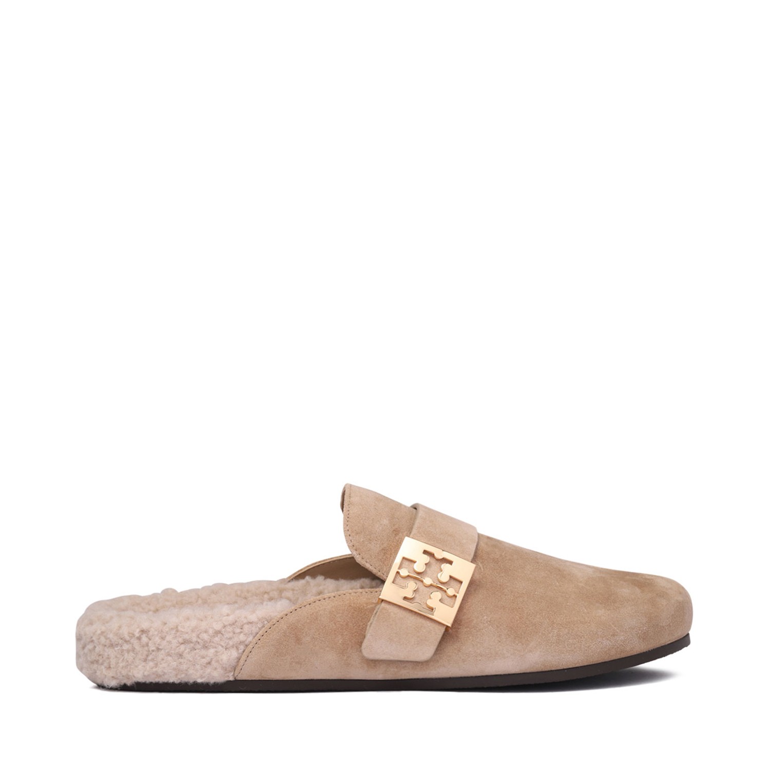 Tory Burch Beige Mellow Mule. Beige suede mule, slip on style, logo buckle detail, gold tone hardware. Round toe, branded insole, faux shearling lining, flat rubber sole.