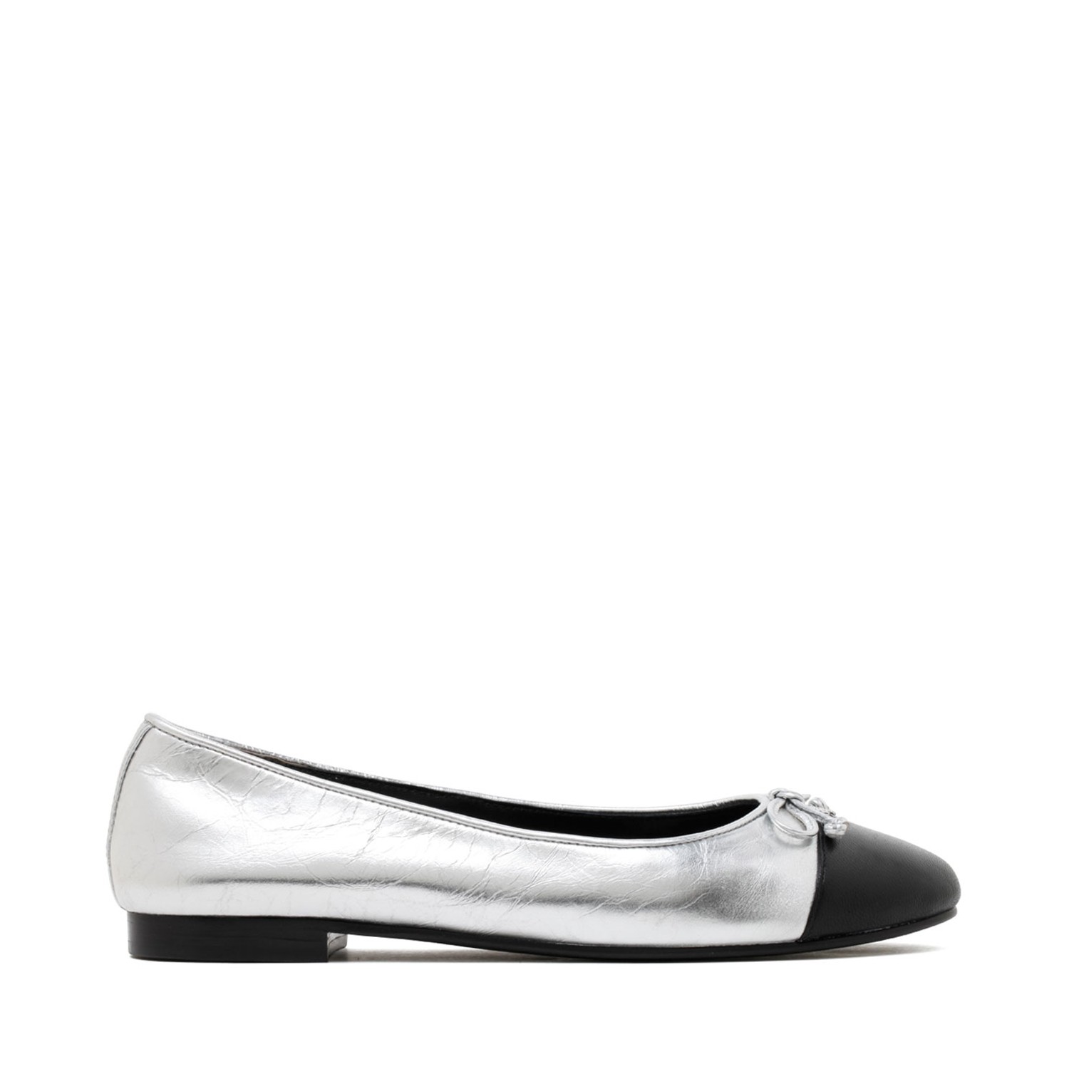 Tory Burch Silver Ballerinas. Silver sheepskin ballerinas, laminated leather, laminated logo, slip on style, round toe.