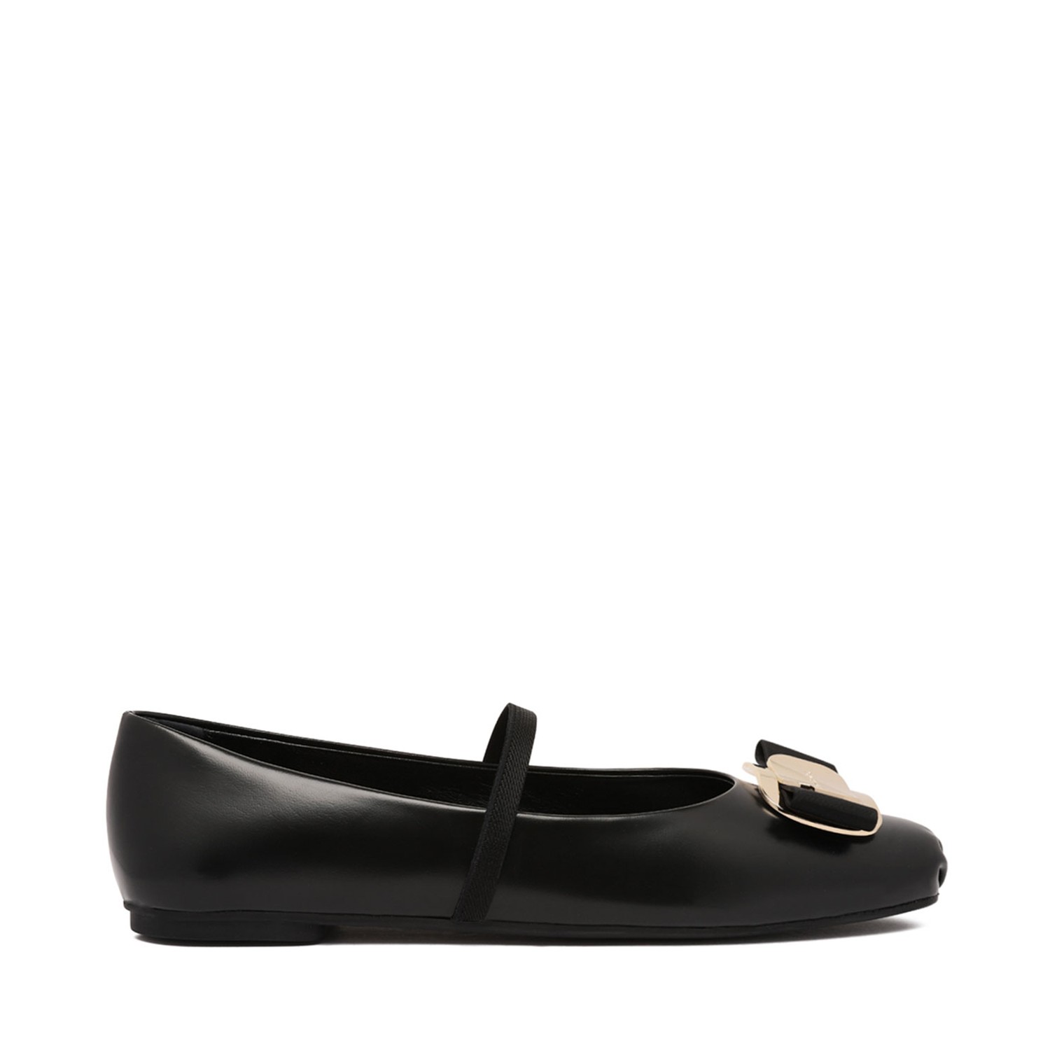 Ferragamo Black New Vara Ballerina Shoes. Black lambskin ballerina shoes with signature Vara bow detail, gold-tone hardware. Round toe, slip-on style, branded leather insole and flat sole.