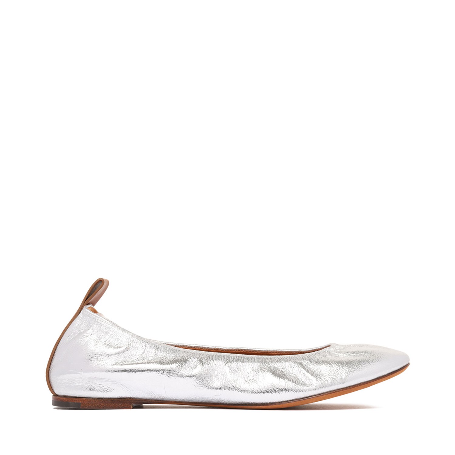 Lanvin Sliver Metallic Ballerina Shoes. Silver calf leather ballerina shoes, metallic finish, round toe, branded leather insole. Contrasting branded heel counter, pull tab at the heel, flat leather sole.