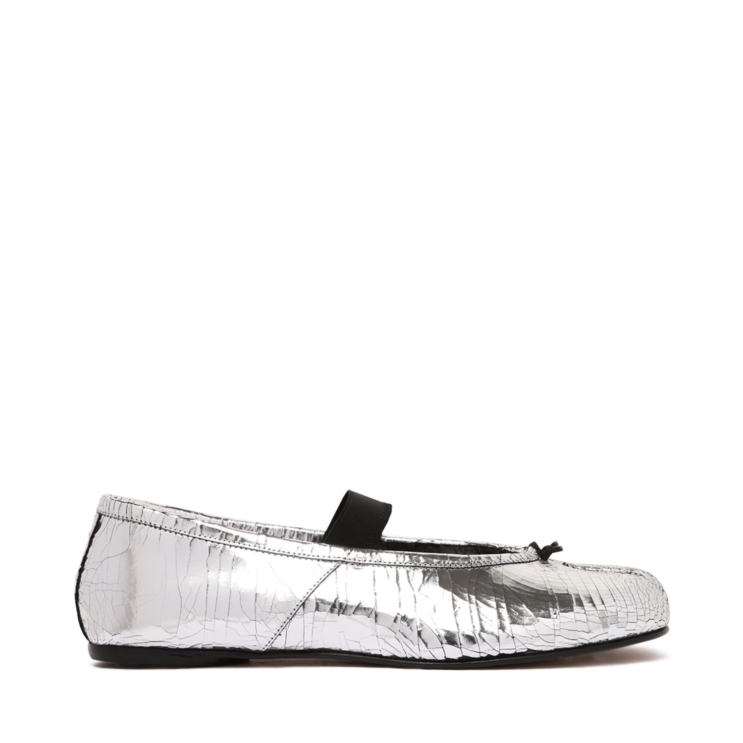Maison Margiela Silver Tabi Ballet. Ballerinas with broken mirror effect, tabi on the toe, white stitching on the back, elastic band, brand logo on the upper.