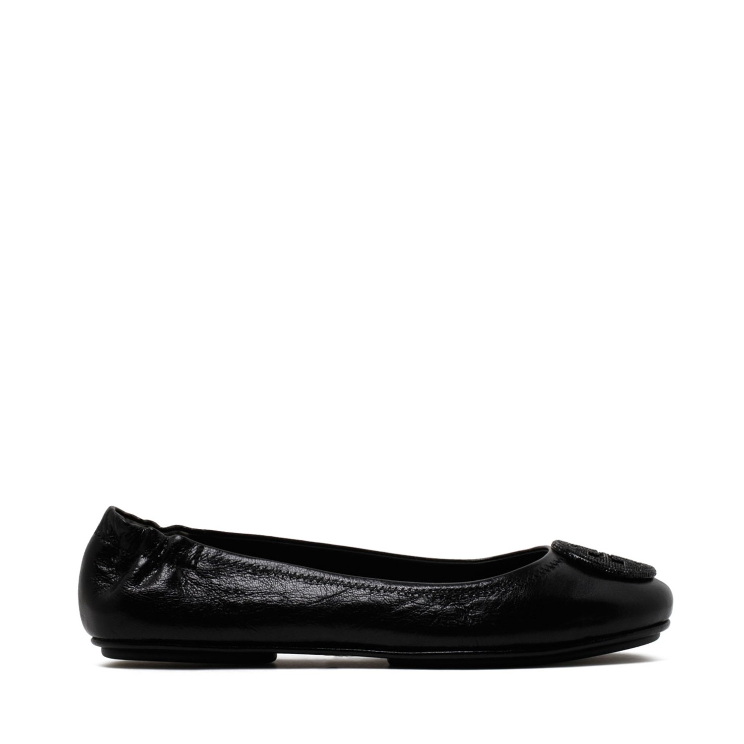 Tory Burch Black Minnie Travel Pave Dancer. Black leather ballerina shoes, double T in crystal pave, padded sole, nappa lining, grooved rubber outsole.
