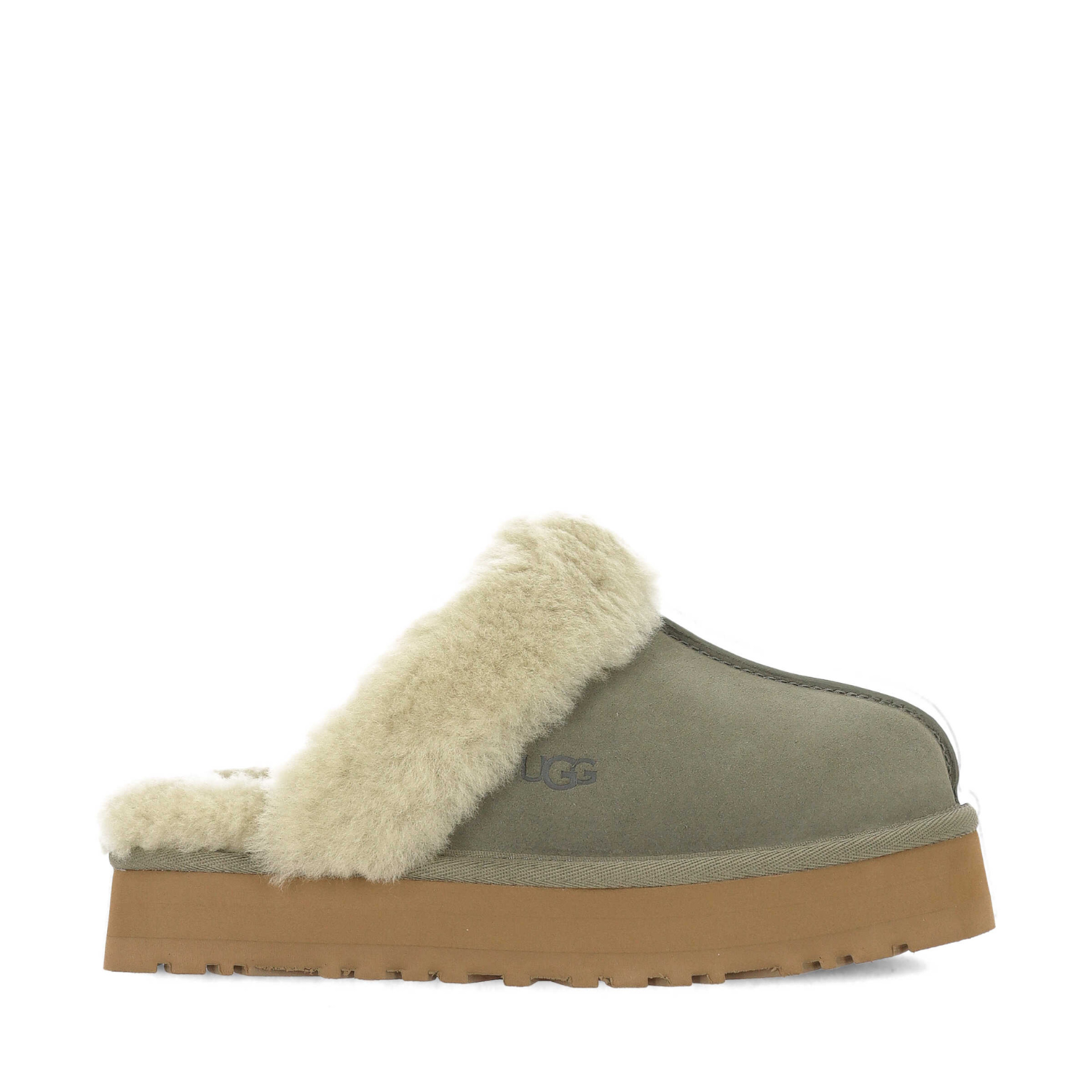 UGG Moss Green Disquette Slippers. Moss green suede upper slippers with sheepskin lining, platform and shearling finish.