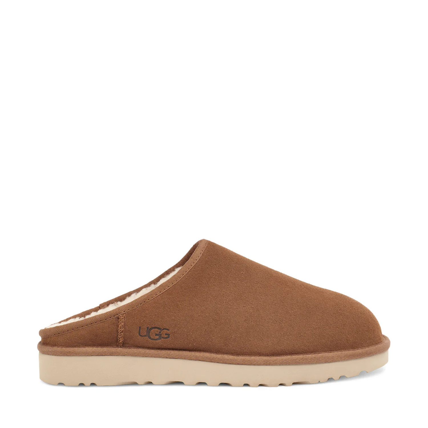 UGG Chestnut Classic Slip On Slippers. Chestnut classic slip-on slide with suede upper. UGG plush regenerated wool and Tencel lyocell lining, sheepskin insole, recycled polyester fiber rand, EVA outsole. Heat-stamped UGG logo on the upper.