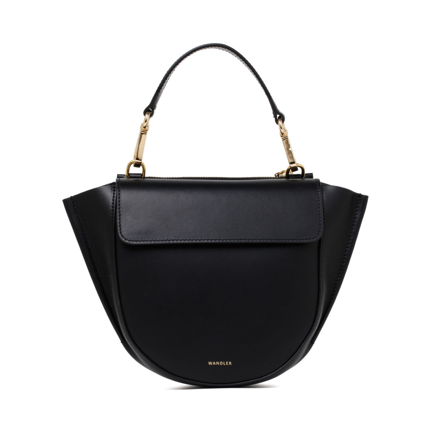 Wandler Hortensia Black Mini Bag. Black mini bag with magnetic closure, main compartment, zip-fastening pocket and internal slip pocket. Single top handle. Detachable shoulder strap. Can be worn as a handbag or crossbody.