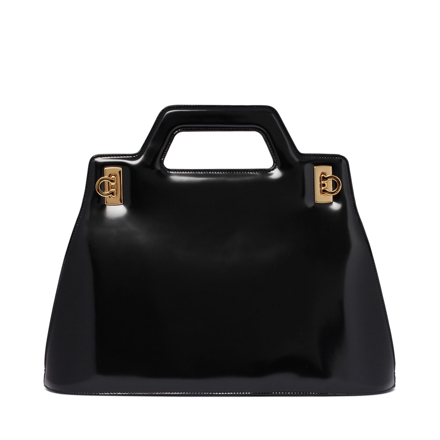 Ferragamo Black Wanda Hand Bag. Black brushed calfskin hand bag, flared design, snap Gancini buckle closure. Leather interior, two patch pockets, laminated Ferragamo logo. Flat brushed leather shoulder strap, adjustable and removable. Double rigid handles.