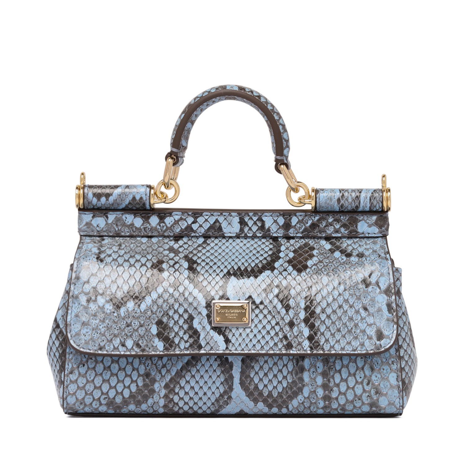 Dolce & Gabbana Light Blue Sicily Small Handbag. Light blue small Sicily handbag made of python with front flap with hidden double magnet closure. Bigalvanic logo tag, Top handle and adjustable and removable python shoulder strap. Nappa lining and flat pocket.
