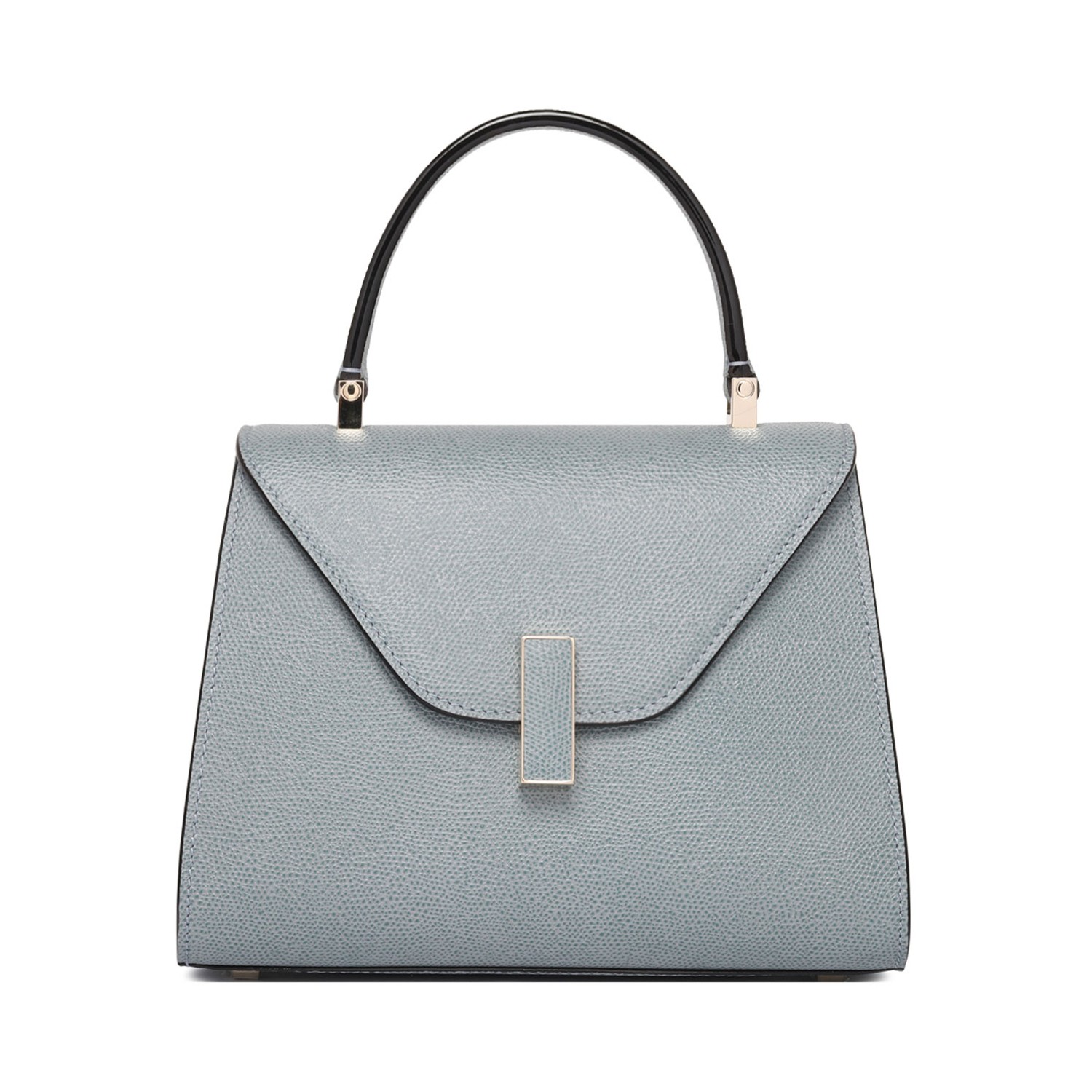 Valextra Smokey Blue Iside Mini Tote Bag. Smokey blue calf leather mini tote bag, pebbled texture, turn-clasp fastening, trapeze body, single flat top handle. Adjustable shoulder strap, foldover top, metal feet, main compartment, internal patch pocket. Contrast lining, gold-plated hardware.