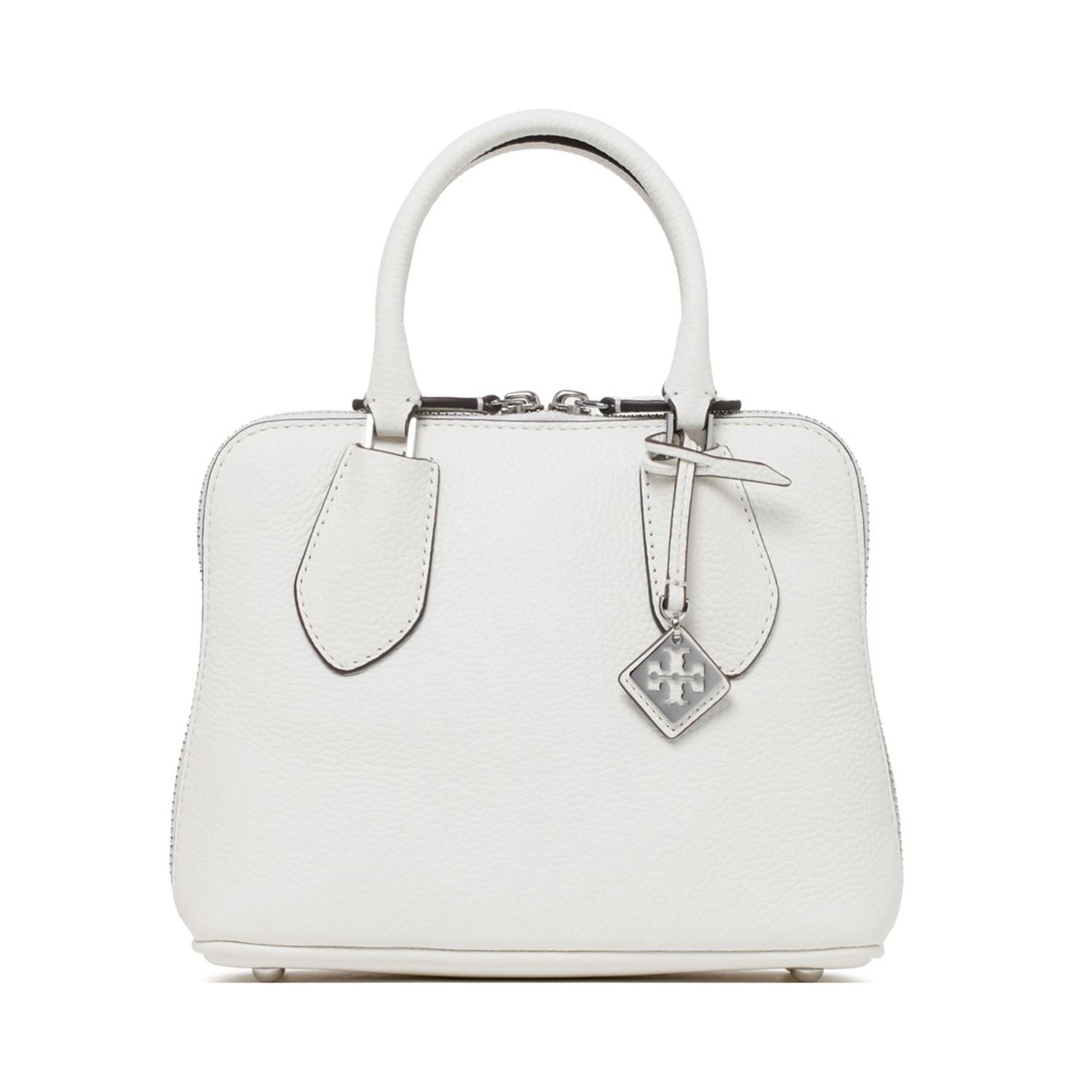 Tory Burch White Mini Pebbled Swing Bag. White calf leather mini bag, logo charm, granted texture, silver metal details. Two way zip closure, adjustable detachable shoulder strap, two rolled top handles, metal feet.
