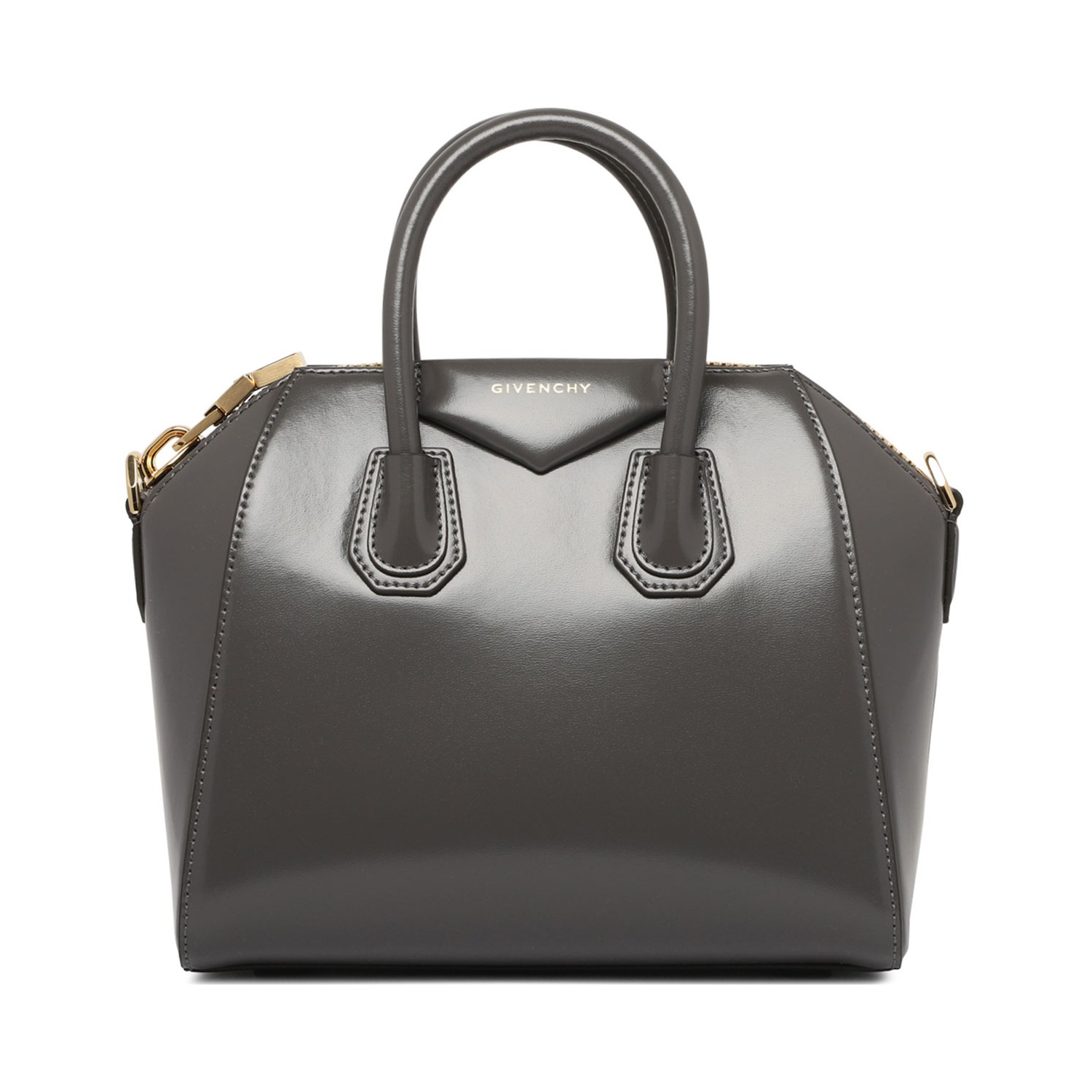 Givenchy Charcoal Antigona Mini Bag. Charcoal box smooth calfskin shoulder bag, Antigona line, zip closure with Givenchy 4G zip puller. Pentagonal application with golden embossed Givenchy signature, adjustable and removable leather shoulder strap, gold finish metal details, one flat pocket and one internal zip pocket.