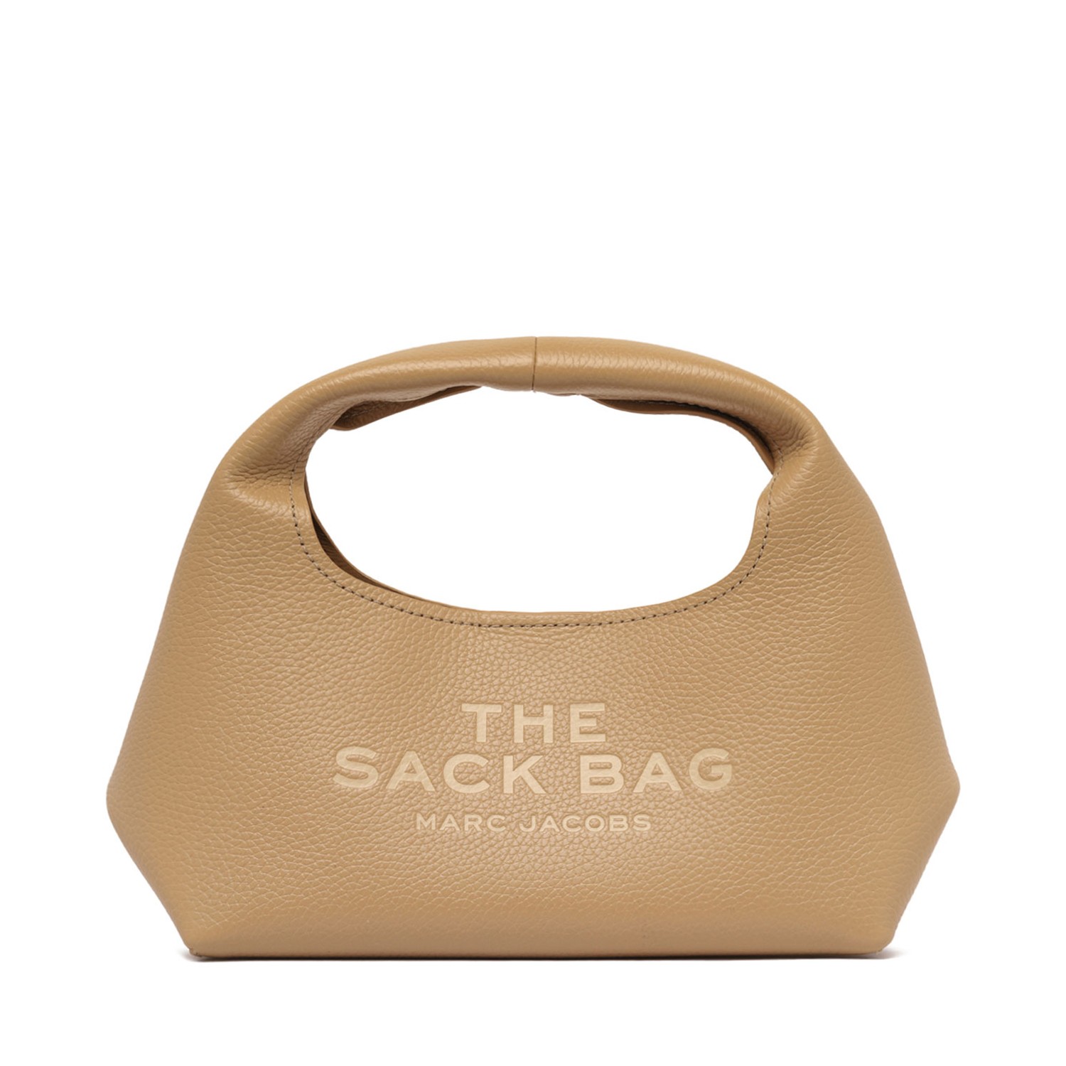 Marc Jacobs Camel Brown The Mini Sack Bag. Camel brown grained leather mini bag with debossed logo to the front, single top handle, magnetic fastening. Partitioned compartment, internal zip-fastening pocket and internal logo patch.