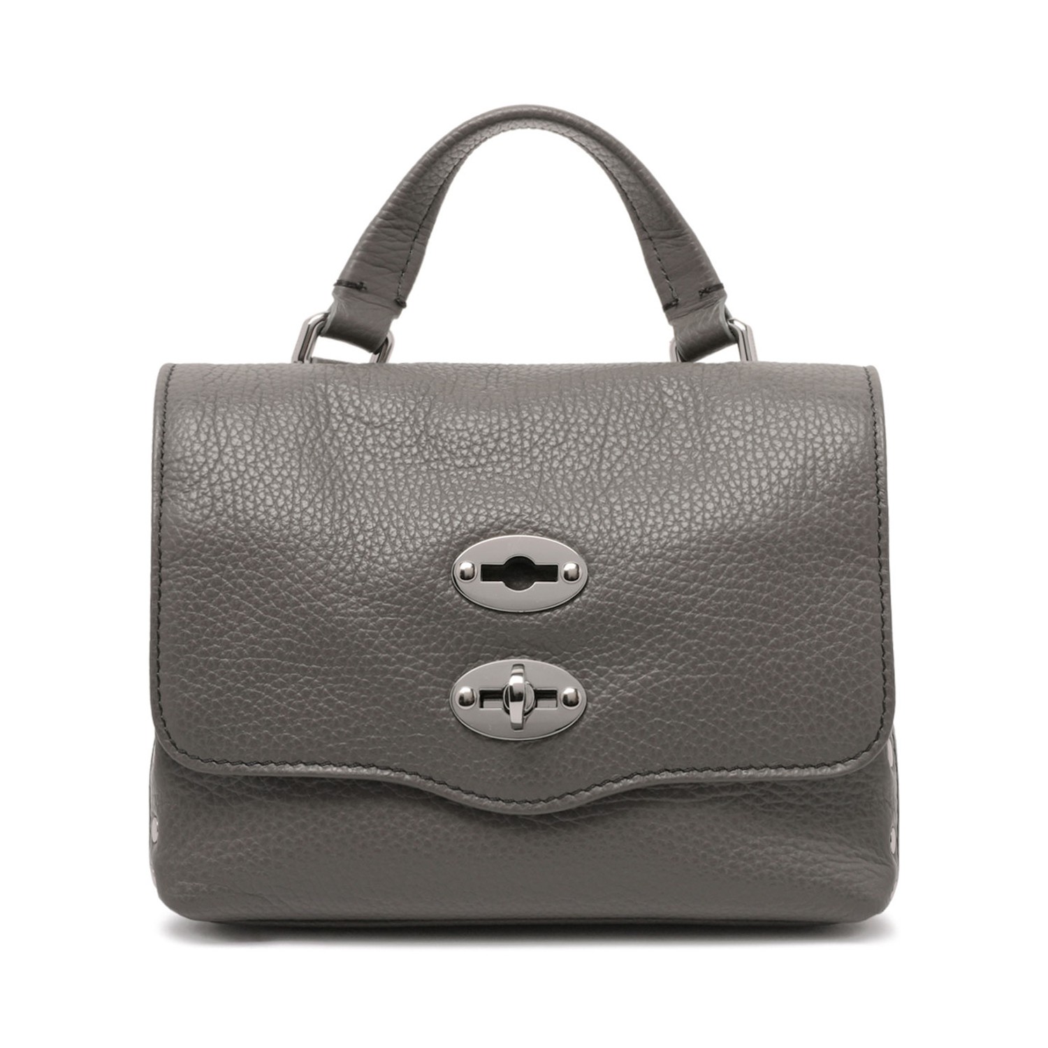 Zanellato Montebianco Postina Baby Bag. Grey hammered leather baby bag with adjustable leather shoulder, twist lock, flat handle and single compartment.