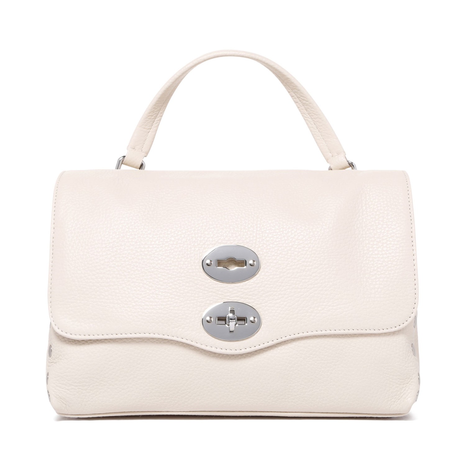 Zanellato Light Beige Small Postina Bag. Light beige small bag in hammered leather with silver-tone hardware, flap top, twist lock closure, internal divided compartment, internal zip pocket and internal gusset pocket.