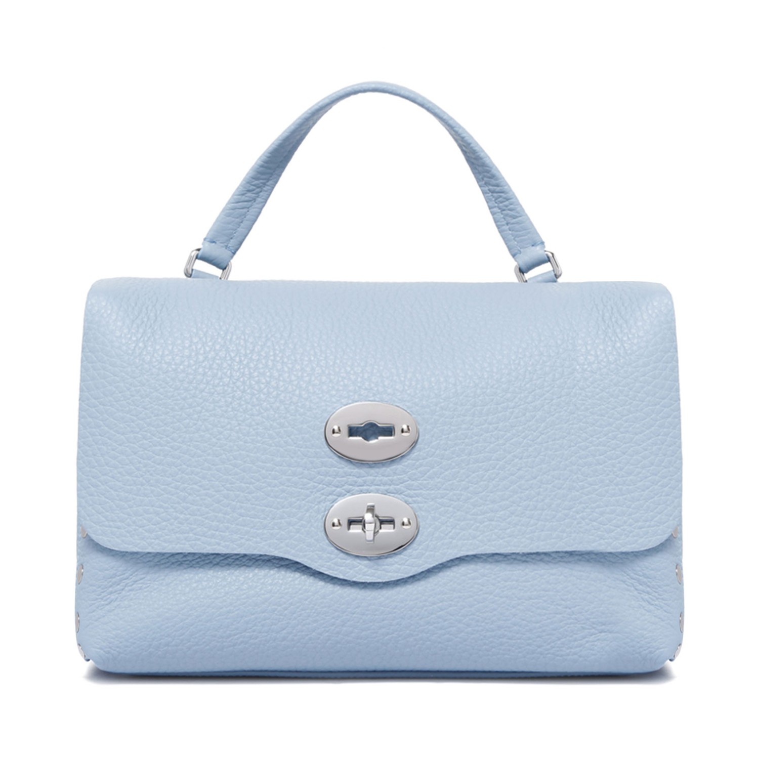 Zanellato Blue Venetian Lagoon Small Postina Bag. Blue Venetian lagoon small bag in hammered leather with silver-tone hardware, flap top, twist lock closure, internal divided compartment, internal zip pocket and internal gusset pocket.