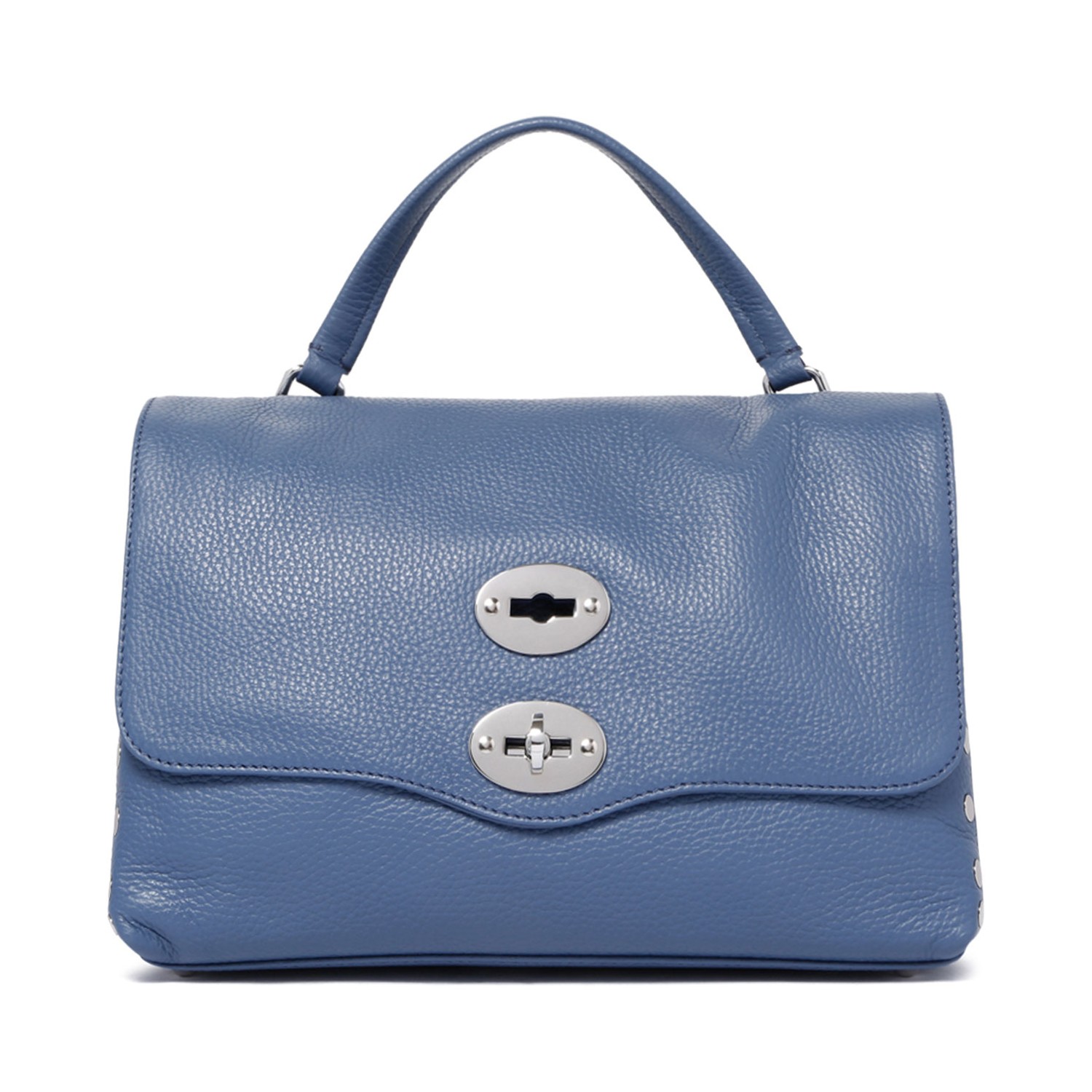 Zanellato Blue Pavon Small Postina Bag. Blue pavon small bag in hammered leather with silver-tone hardware, flap top, twist lock closure, internal divided compartment, internal zip pocket and internal gusset pocket.