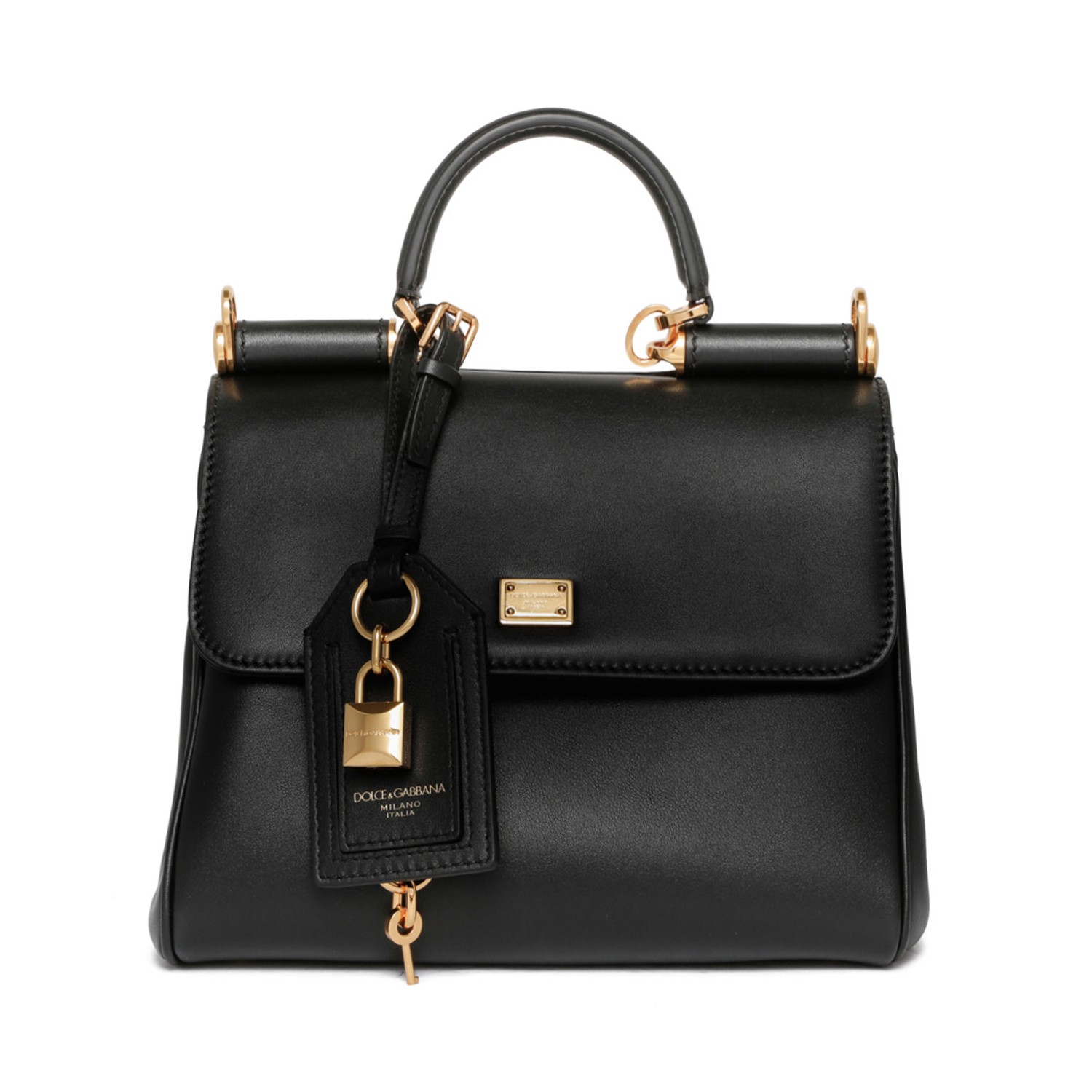 Dolce & Gabbana Black My Sicily Handbag. Black handbag in plonge calfskin with leather handles and removable and adjustable leather shoulder strap. Tuck-in closure, vintage brass plating. Monogalvanic plate and stamp with film, interior with zip pocket.
