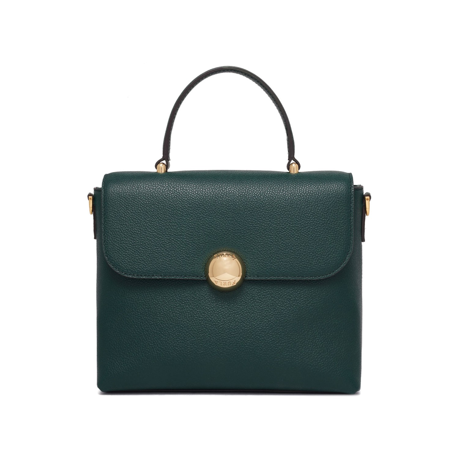 Furla Dark Green Small Moonlight Hand Bag. Dark green small hand bag with single top handle, gold-tone clasp, detachable shoulder strap and structured shape.