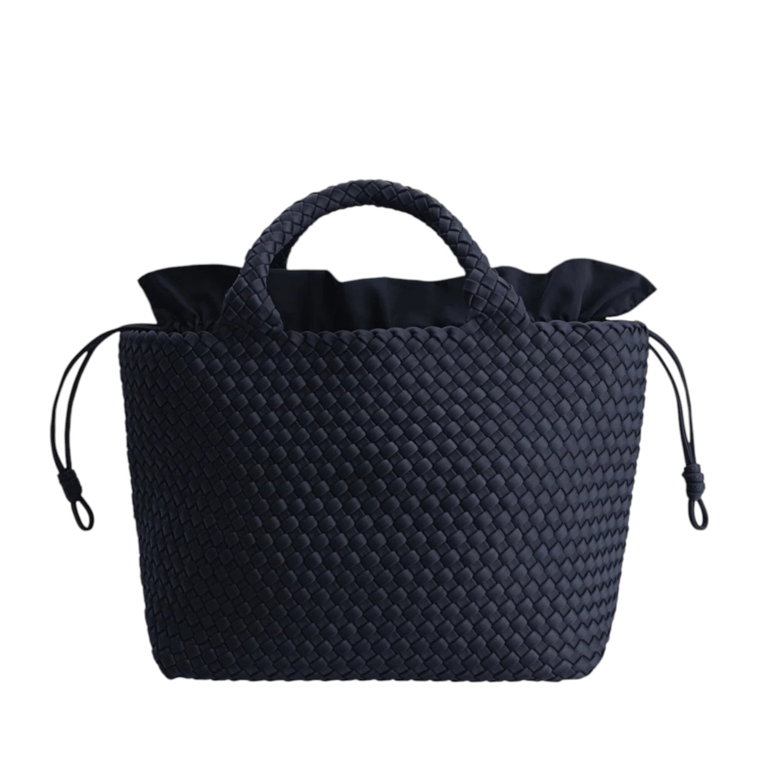 Marrea Navy Blue Medium Hand Bag. This bag is a must-have for anyone who wants to stand out. Whether it's the gym, a day at the beach, or a weekend getaway, this spacious bag is the perfect companion for all occasions. The Coco Fresco color is a medium brown with urban elegance. The bag is hand-woven from neoprene and suits every season, every look, and every mood. Equipped with two handles, you can carry it in your hand, on your elbow, or on your shoulder. The bag is easily washable and includes a water-resistant inner bag.