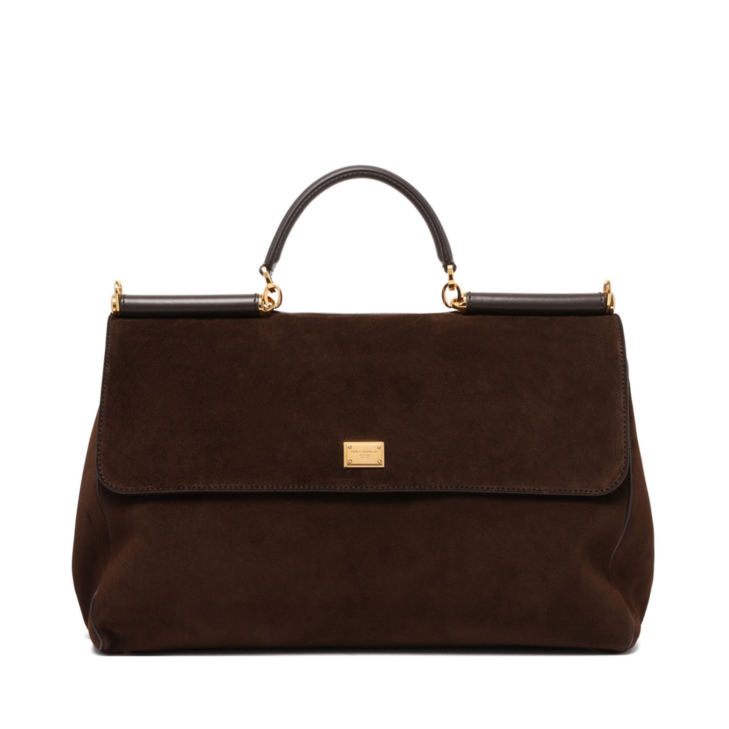 Dolce & Gabbana Brown Calfskin My Sicily Handbag. Black My Sicily handbag is a symbol of timeless elegance, made of split calfskin with vintage brass details, it is perfect for any occasion. Leather handles and removable and adjustable leather shoulder strap, tuck-in closure, vintage brass plating. External customization with monogalvanic plate and stamp with film, interior with zip pocket and flat pocket.