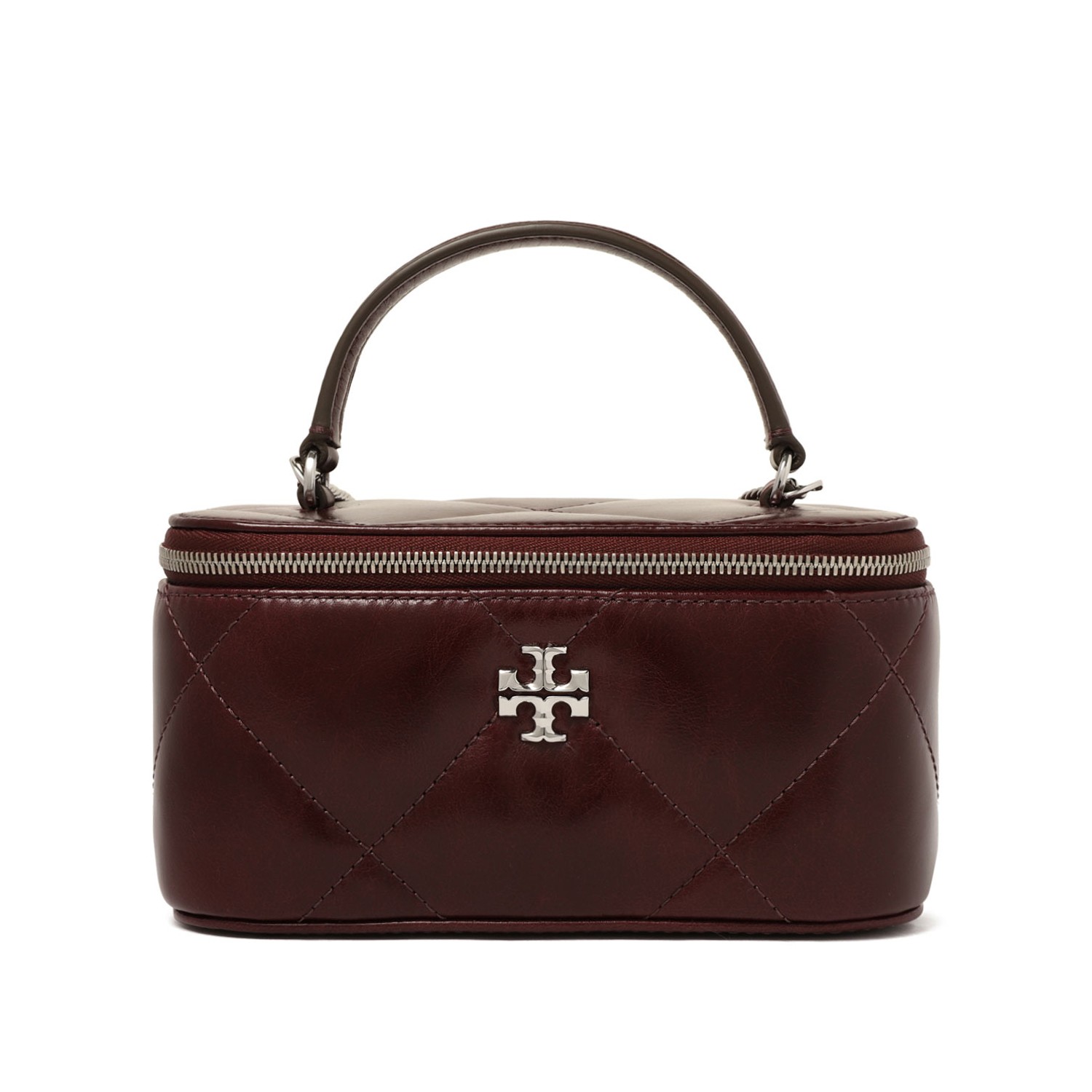 Tory Burch Dark Carmine Kira Jewelry Box. Dark carmine crafted from leather with a lightly distressed finish, the Kira diamond-quilted jewelry case is irresistibly soft thanks to its craftsmanship. A classic shape made soft and practical, embellished with double-T details. Carry it by the top handle or with the removable shoulder strap.