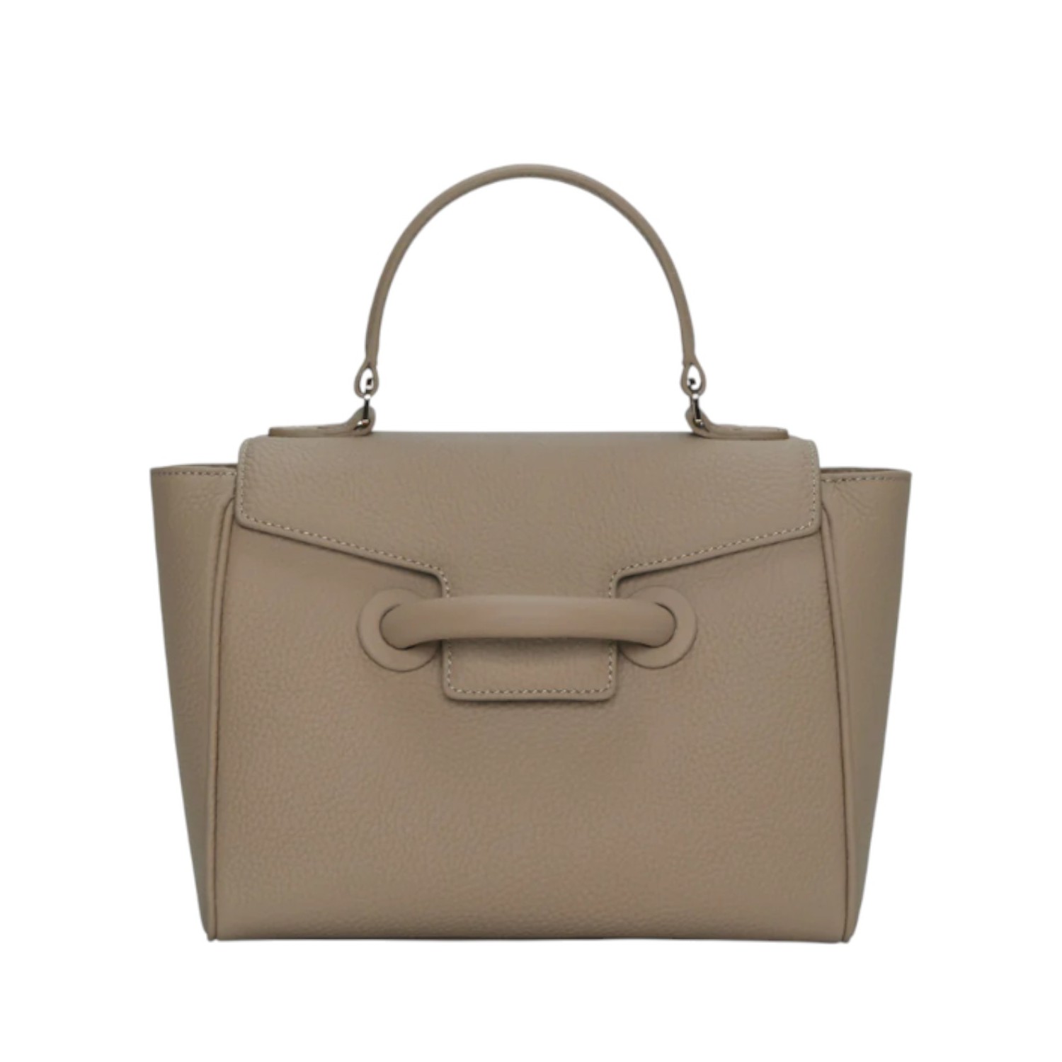 Vasic Stone Ever Mini Bag. Stone leather handle bag with front buckle and branded hardware, reinforced with a hidden metal clasp for secure closure. Lined with an interior zipper pocket and detailed with a long back pocket with snap closure to keep your phone close and secure. Remove the adjustable shoulder strap to carry as a refined handbag.