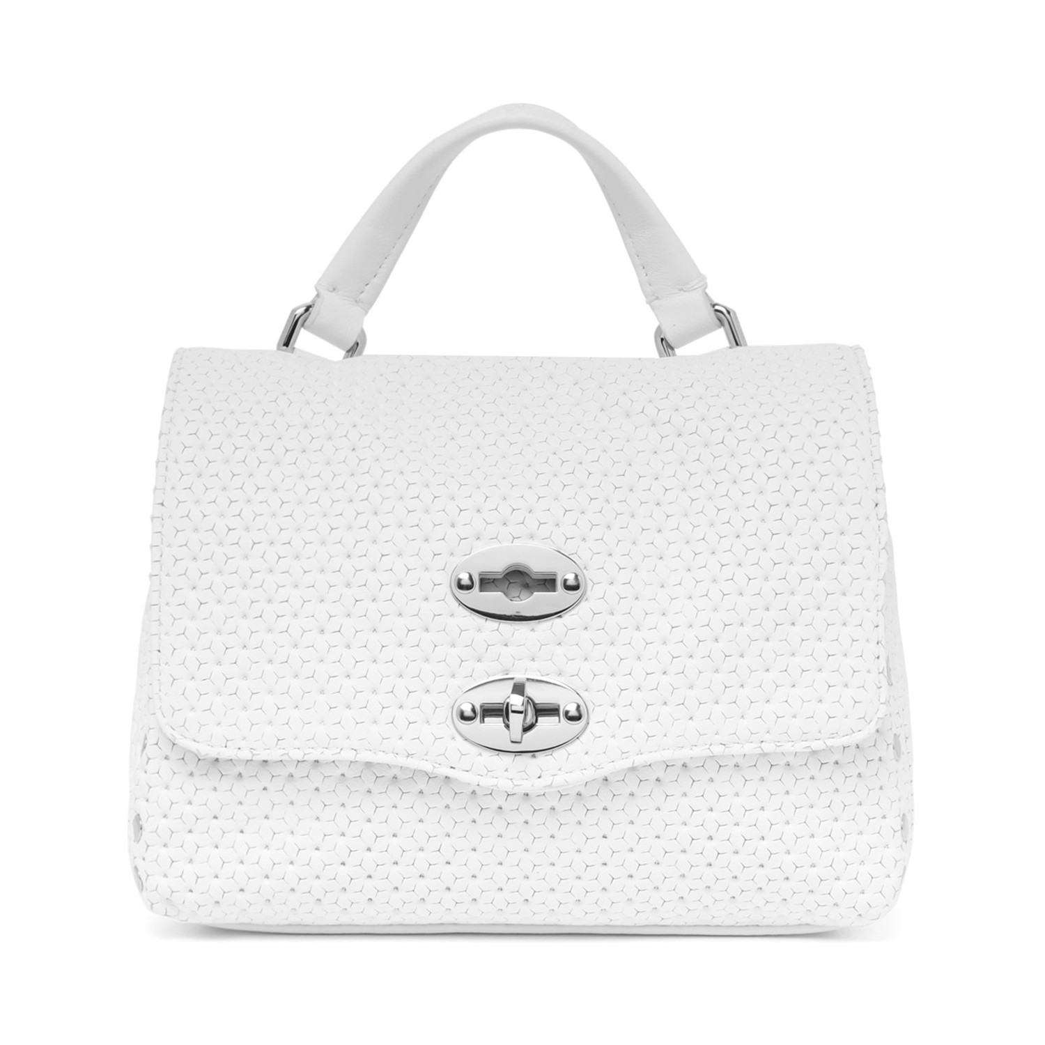 Zanellato White Perfored Leather Baby Bag. The Postina Zanellato is designed for those who seek iconic accessories without sacrificing practicality. Crafted from perforated leather, the bag features an adjustable leather shoulder strap that allows it to be carried over the shoulder, giving it a unique and playful look.