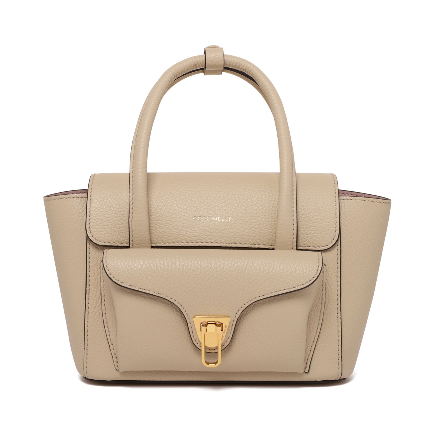 Coccinelle Sandshell Double Beat Small Bag. Sandshell grained leather hand and shoulder carry bag with magnetic closure, adjustable and removable shoulder strap. Removable iconic Beat front pocket, featuring a sleeve on the back and a chain for shoulder portability. Two internal pockets, one of which is closed with a zip, gold plating and gold stamp logo.