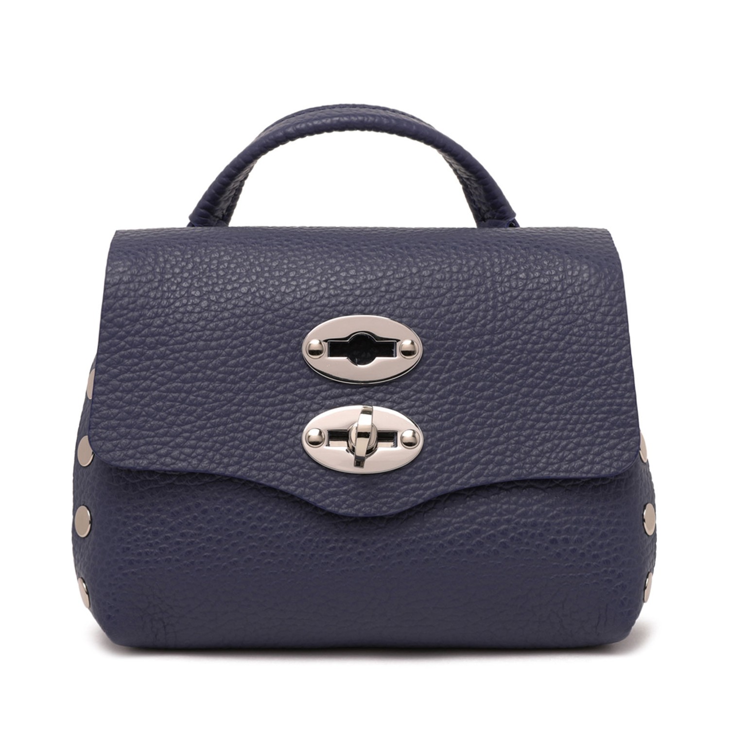 Zanellato Blue Sogno Super Baby Bag. Blue sogno hammered leather super baby bag with adjustable shoulder strap, metallic details.