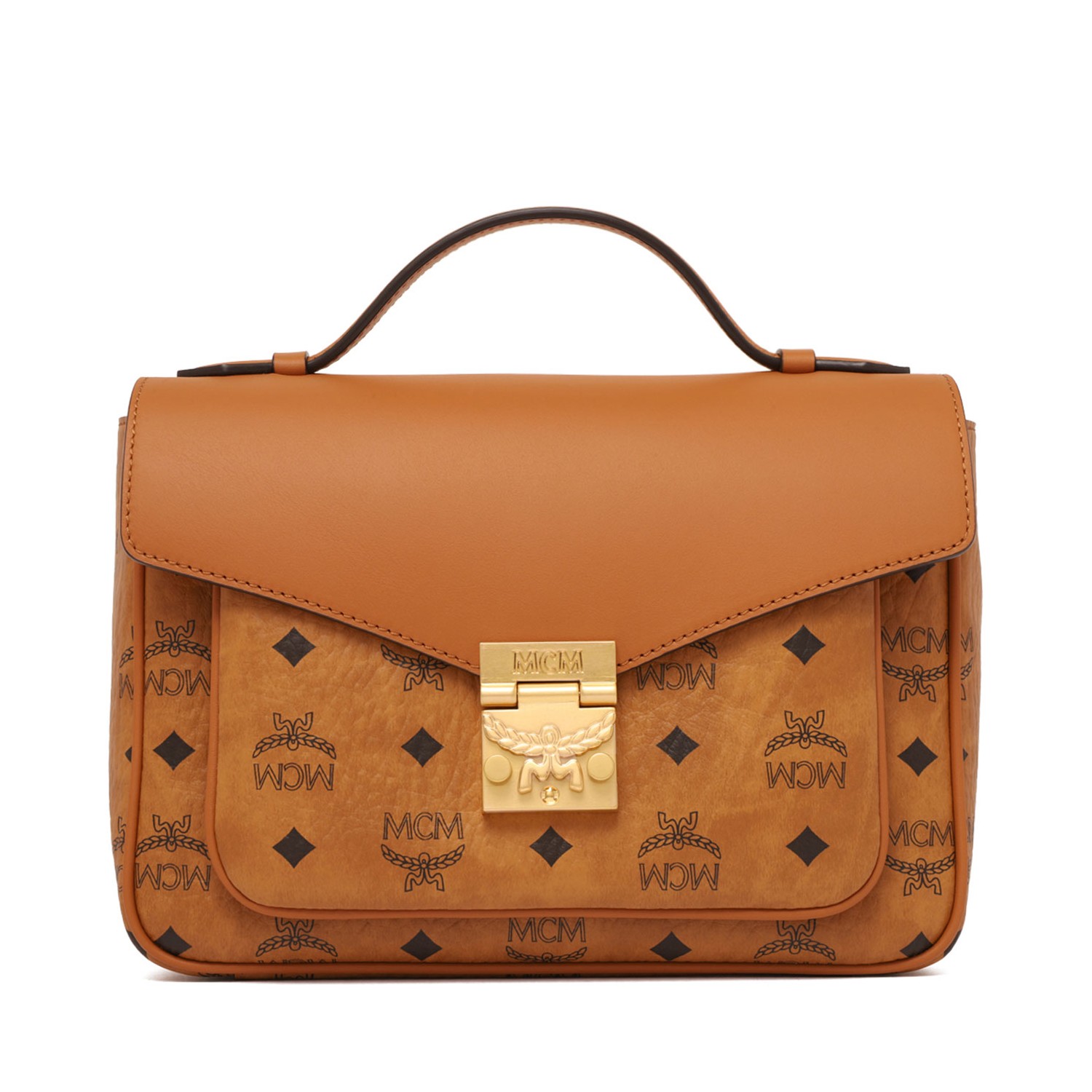 MCM Brown Tracy Small Handbag. Brown leather and canvas small handbag in rectangular shape with MCM logo and laurel print, large gold-tone clasp, wide strap.
