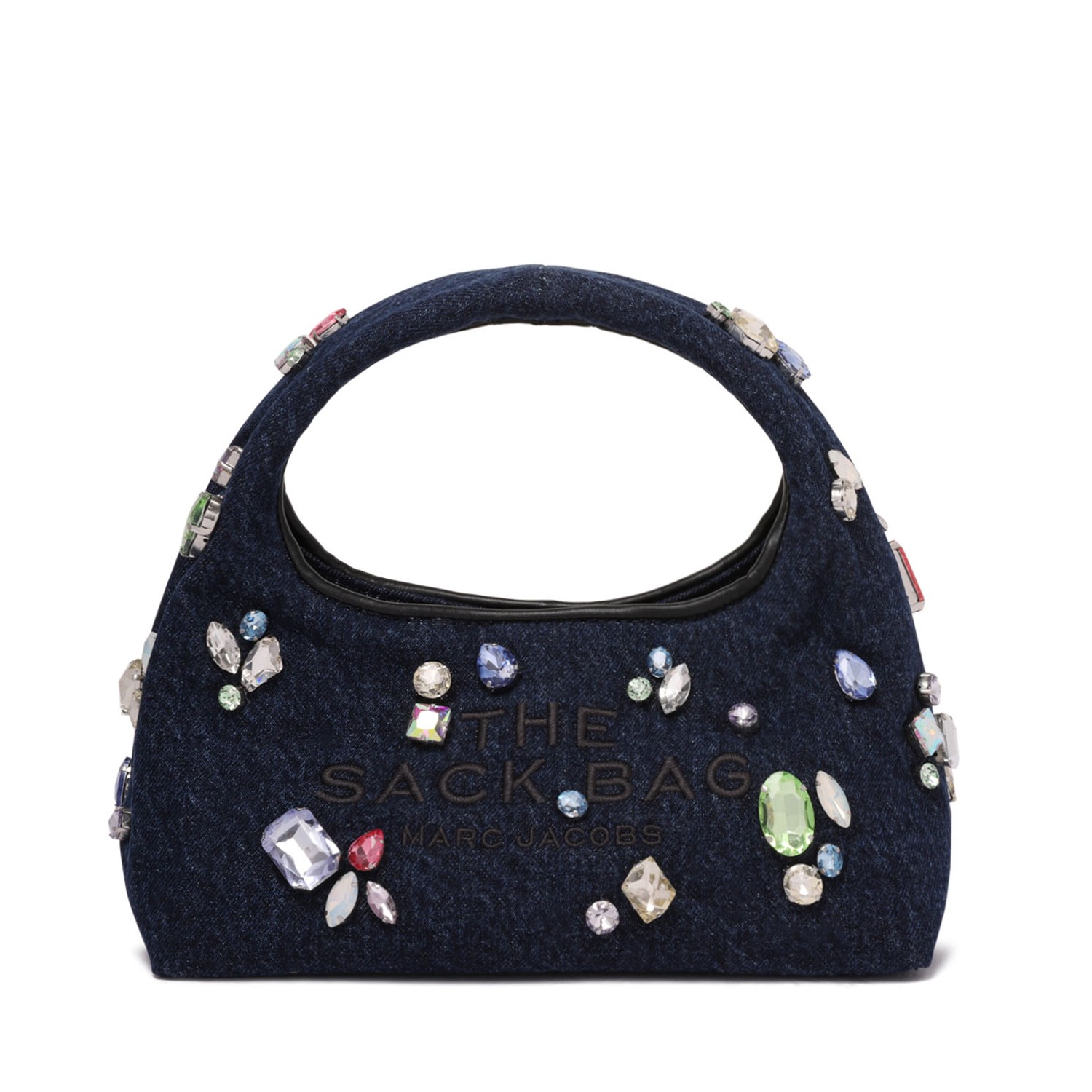 Marc Jacobs The Gem Denim Mini Sack Bag. Crafted in denim, this reimagined Mini Sack features runway-inspired gem embellishments for a playful, glamorous twist. With an easy magnetic closure and removable zip pouch for added organization, it combines style and practicality. Part of our "THE" collection, it showcases embroidered namesake branding for a distinctive touch.