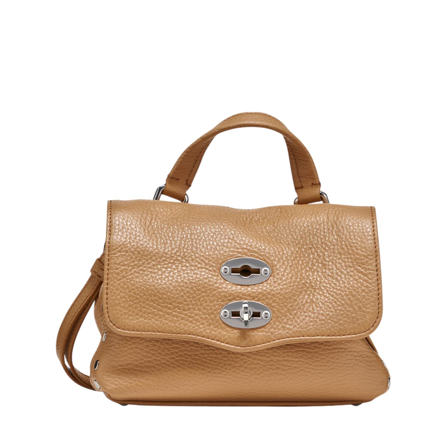 Zanellato Brown Cantucci Postina Baby Bag. Brown cantucci hammered leather baby bag with adjustable leather shoulder, twist lock, flat handle and single compartment.