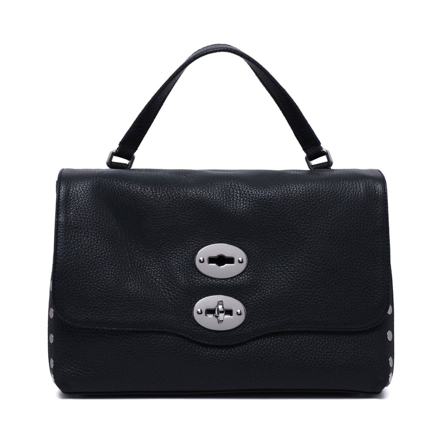 Zanellato Dark Navy Postina Small Bag. Dark navy small bag in hammered leather with silver-tone hardware, flap top, twist lock closure, internal divided compartment, internal zip pocket and internal gusset pocket.