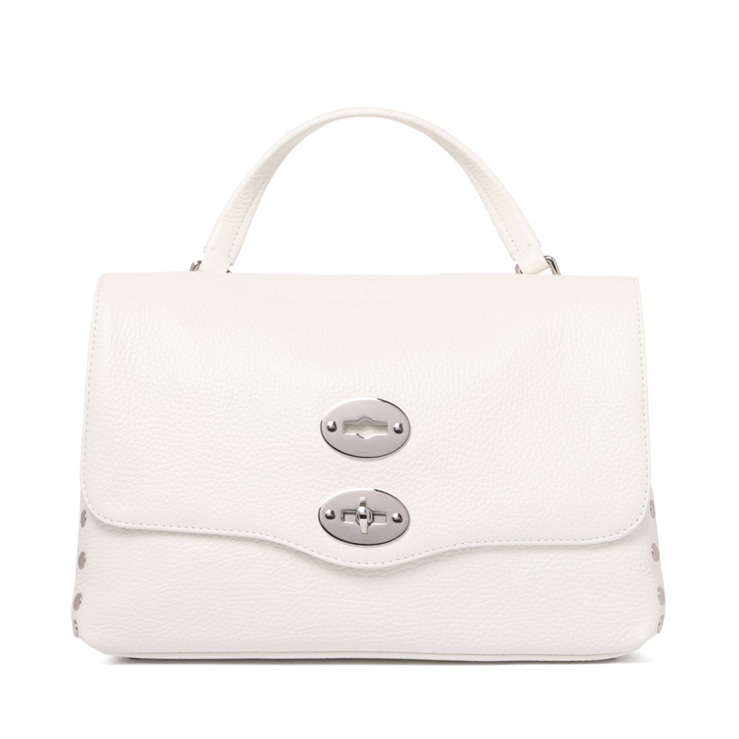 Zanellato White Postina Bag. White calfskin leather bag with silver trim and studs, top handle, twist-lock top closure, inside zip pocket, adjustable and detachable shoulder strap.