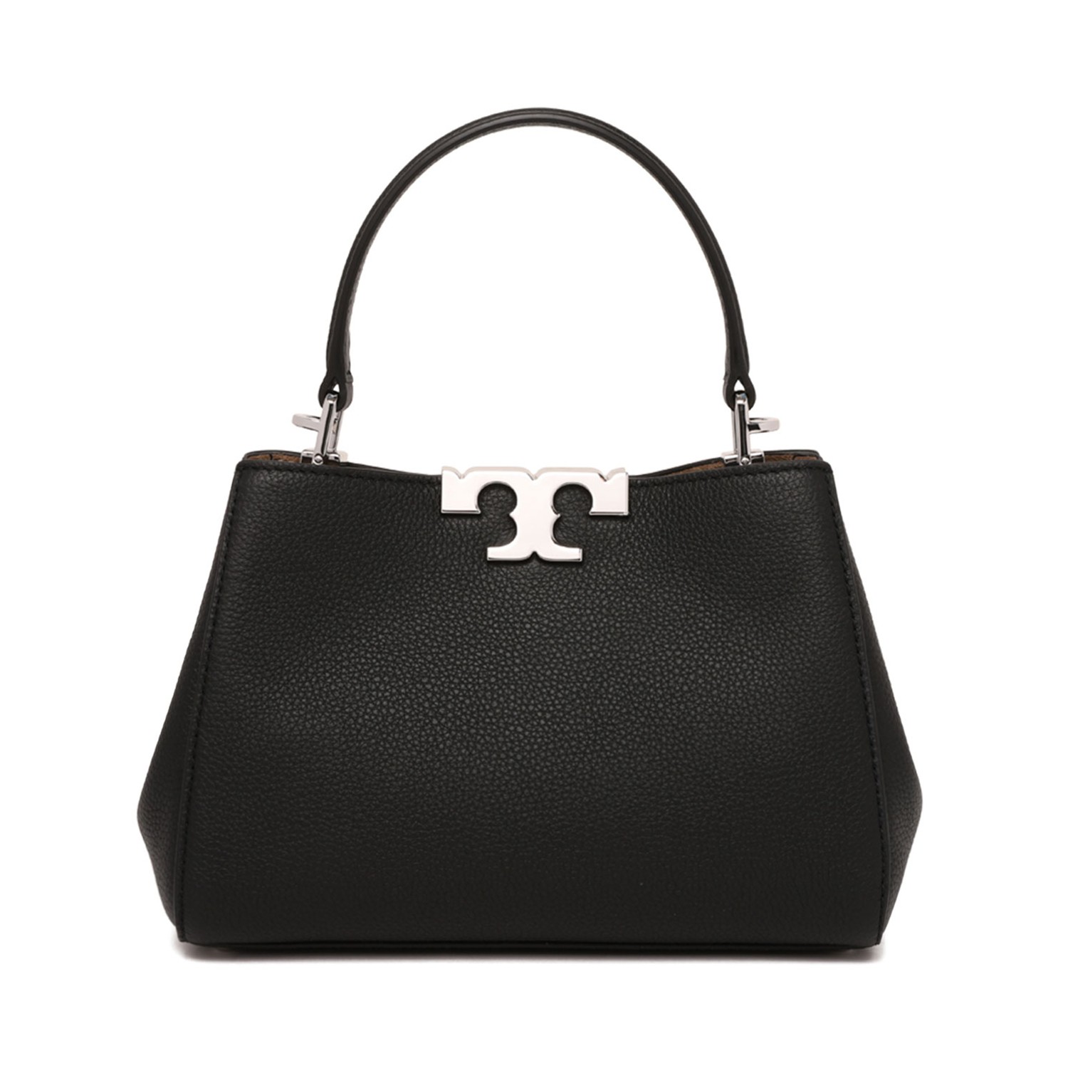 Tory Burch Black Eleanor Mini Satchel Bag. Black mini satchel bag crafted from soft, fine-grained pebbled leather with a semi-matte finish, it features a delicate drape that lends a natural sense of volume, both when closed and open. Fully lined in premium suede, the interior is organized with a central divider and card slots for maximum practicality. The sculptural curves of the iconic double T combine with the magnetic snap closure. A true masterpiece of craftsmanship, designed to be comfortably carried by the top handles or over the shoulder with the removable shoulder strap.