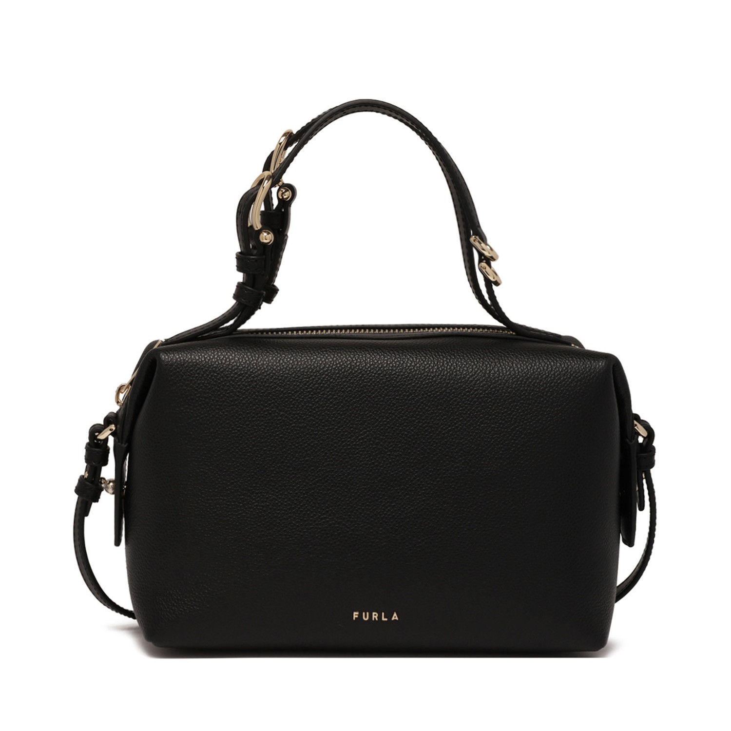 Furla Black Double Boston Bag. Soft lines and a versatile design define the Furla Double satchel. Crafted from premium grained calfskin, this mini bag is perfect for leisure. The adjustable and removable shoulder strap offers multiple carrying options. The two handles are decorated with the iconic metal Archi logos and a D-ring for attaching charms to personalize your look.