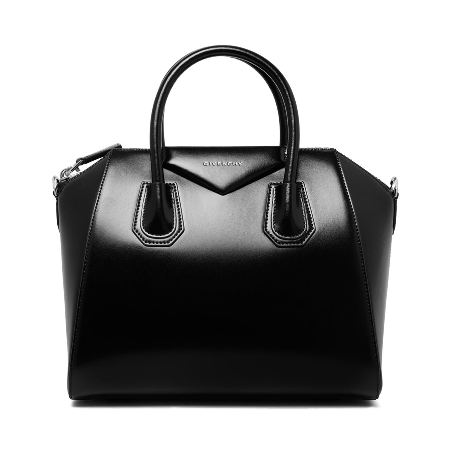 Givenchy Black Antigona Small Leather Box Bag. Black small handbag or shoulder bag in box calfskin, Antigone Line with zip closure, leather handles. Removable leather shoulder strap, pentagonal applique with gold-embossed Givenchy signature and gold finish metal details.