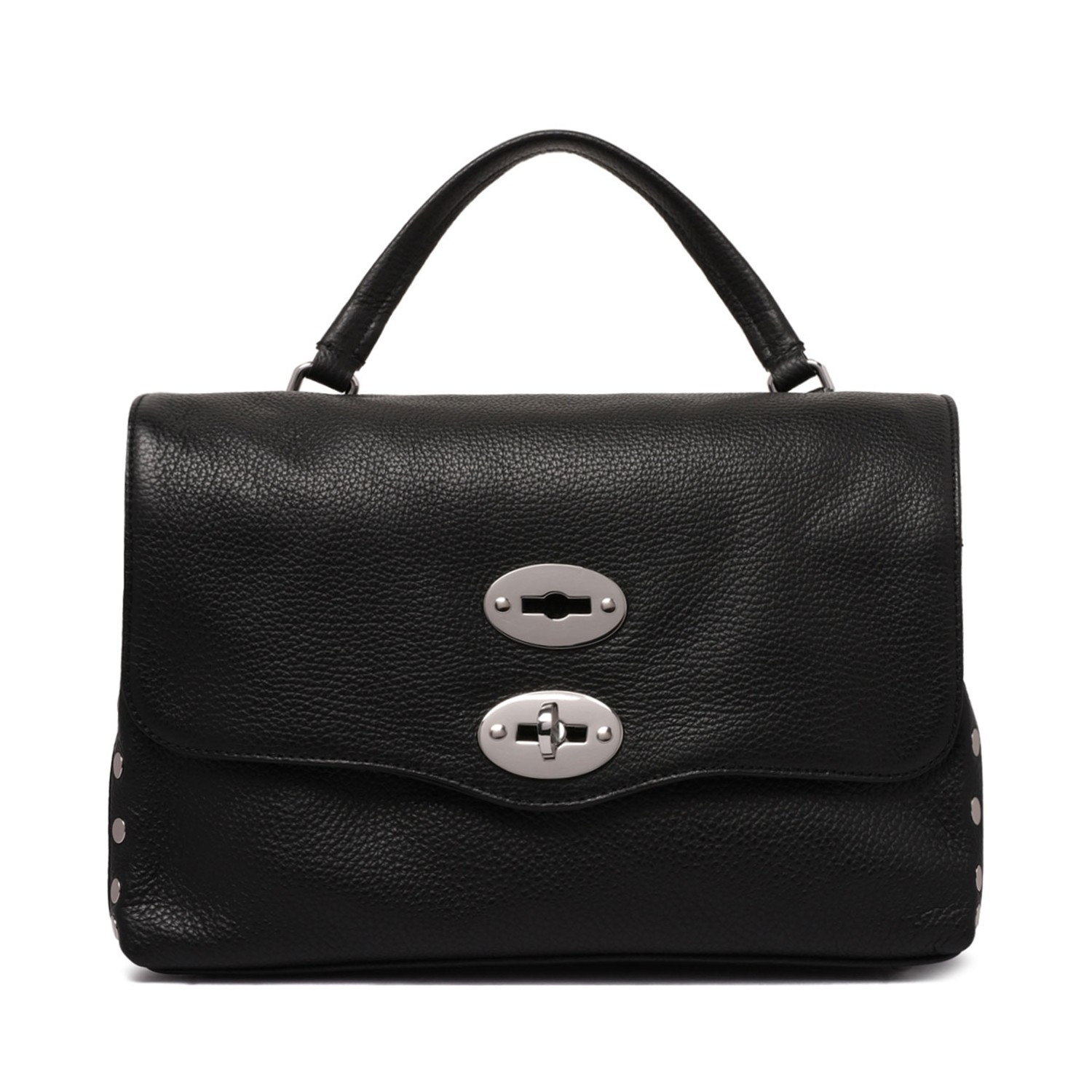 Zanellato Black Small Postina Bag. Black small bag in hammered leather with silver-tone hardware, flap top, twist lock closure, internal divided compartment, internal zip pocket and internal gusset pocket.