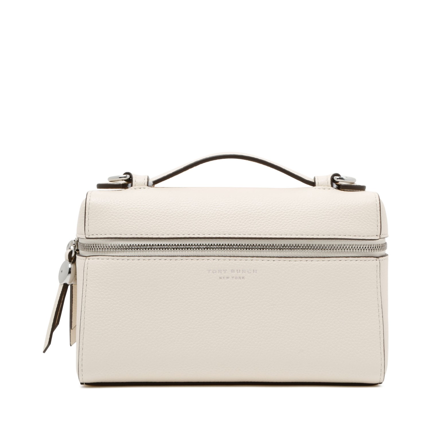 Tory Burch Cream Leather Top Handle Bag. Cream top handle bag with a structured, contemporary silhouette. Bag crafted in soft grained leather with a refined, durable finish. Featuring a top zip closure, front zip compartment and subtle Tory Burch logo detailing on the front. Designed with a single top handle and detachable shoulder strap for versatile carry options, completed with silver-tone hardware for a polished, elegant look.