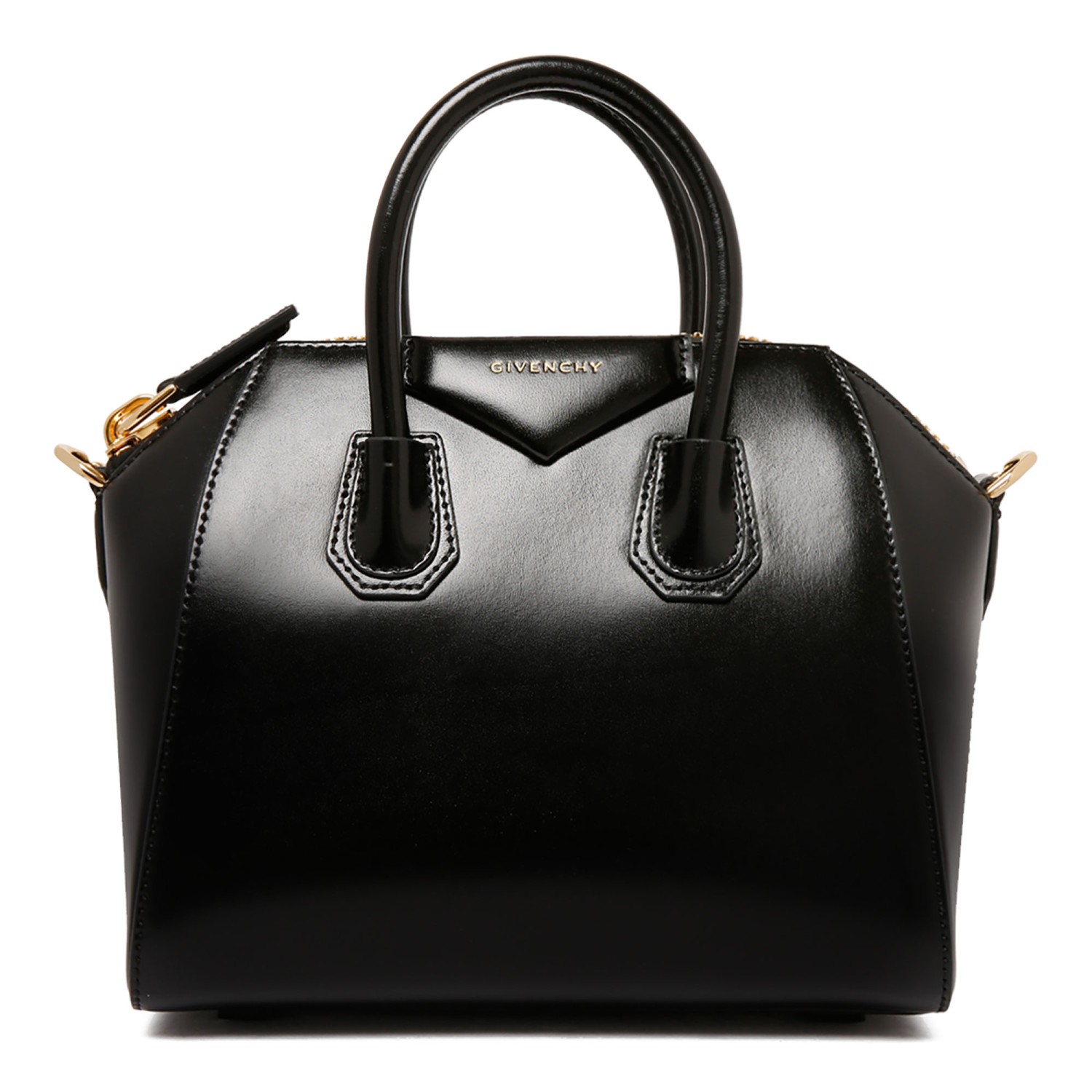 Givenchy Black Antigona Mini Leather Shoulder Bag. Black mini leather shoulder bag with xip closure and two leather handles. Removable leather shoulder strap, one zip pocket and one internal flat pocket.