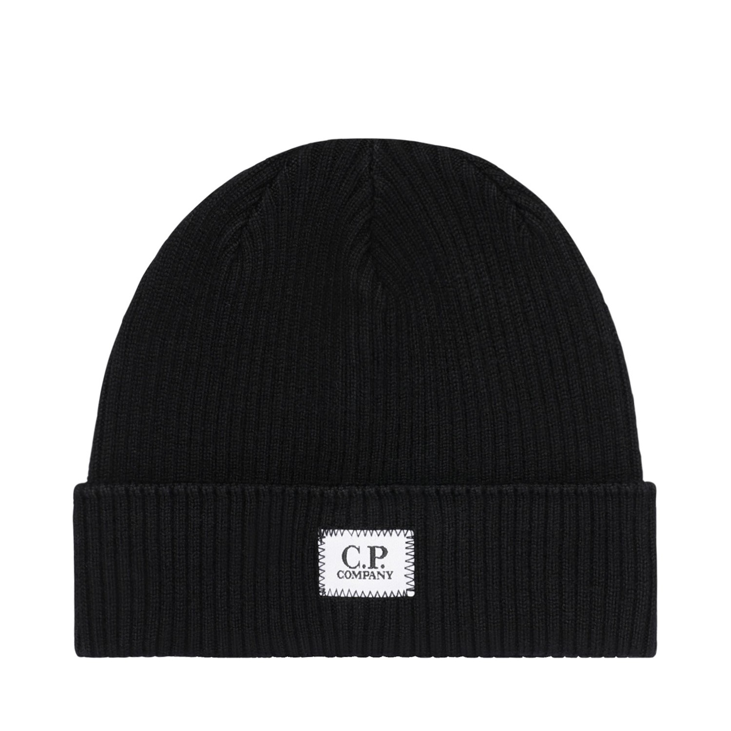 C.P. Company Kids Black Logo Patch Hat. Black wool hat, logo patch to the front.