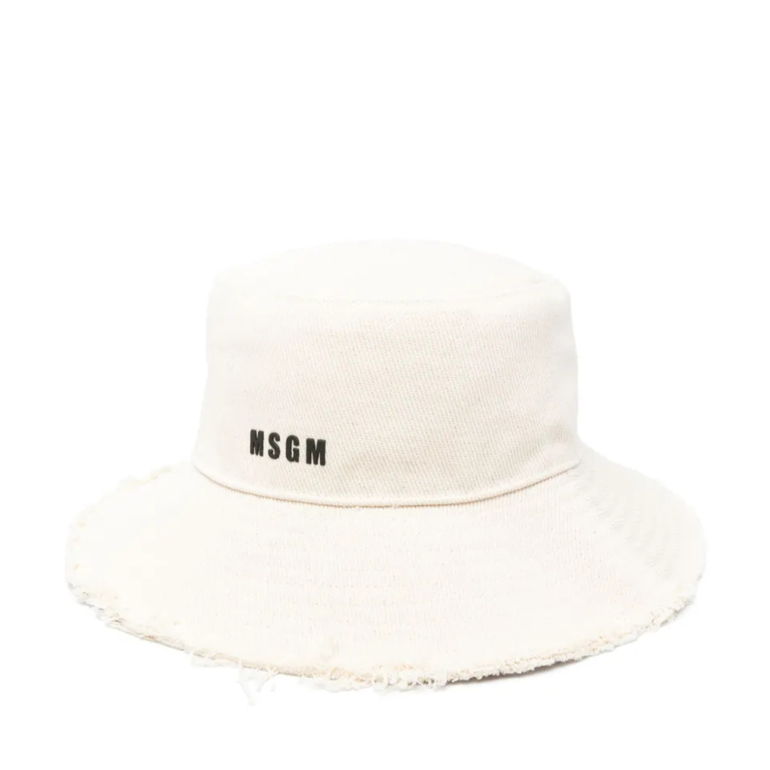 MSGM Kids Cream Logo Embellished Hat. Cream cotton hat with logo embellished to the front, flat crown, dropped narrow brim, raw-cut finish.