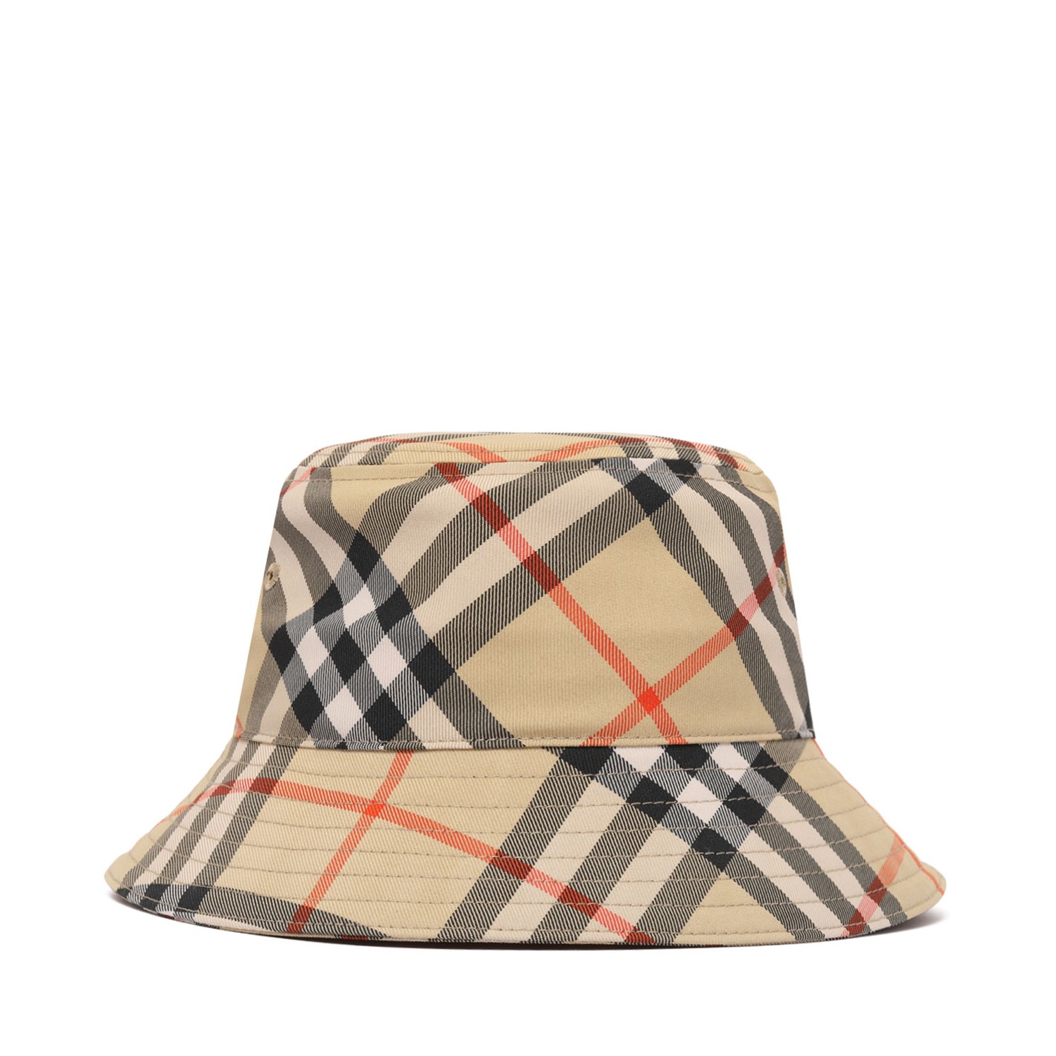 Burberry Kids Check Bucket Hat. Sand beige bucket hat, twill weave, Vintage Check pattern, dropped narrow brim.