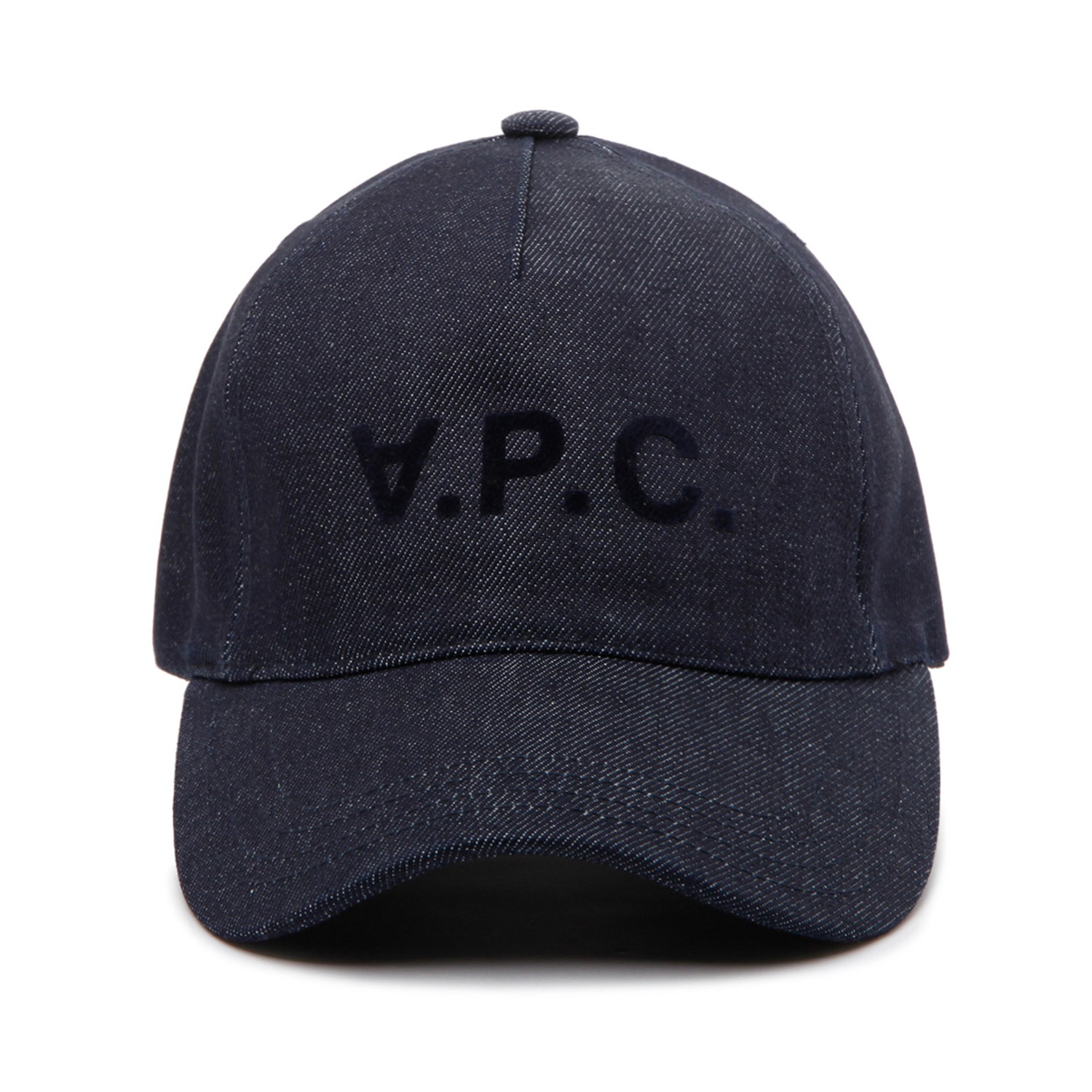 A.P.C. Indigo Logo Print Denim Cap. Indigo cotton blend cap, navy blue logo print to the front, silver tone hardware, curved narrow brim, adjustable strap to the rear.