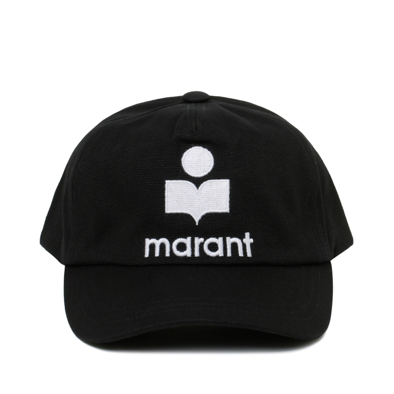Isabel Marant Black Tyron Baseball Cap. Black cotton baseball cap, embroidered logo to the front, curved peak. Fabric covered button at the crown, rear touch strap fastening.