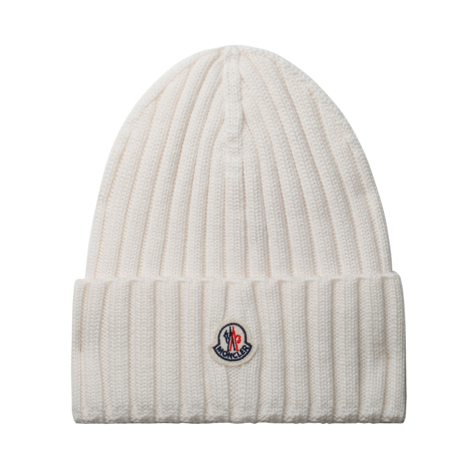 Moncler Cream White Beanie. Cream white virgin wool beanie, knitted construction, ribbed knit. Curved peak, logo patch to the front and turn up hem.