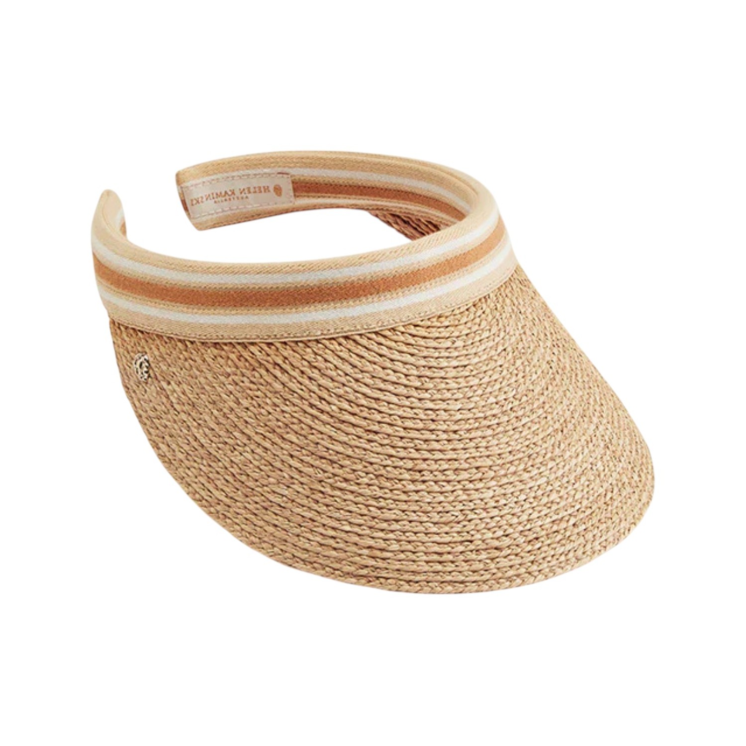 Helen Kaminski Natural Nougat Stripe Kirsten Visor. Delightful all year round, Kirsten is crafted from sustainably harvested, hand-braided Madagascan raffia. The style features a 12cm peak, inner neoprene band and size adjustable elastic fastening. Rollable and designed with a securing hook, Kirsten makes for the perfect casual off-duty travel or daily walk companion.