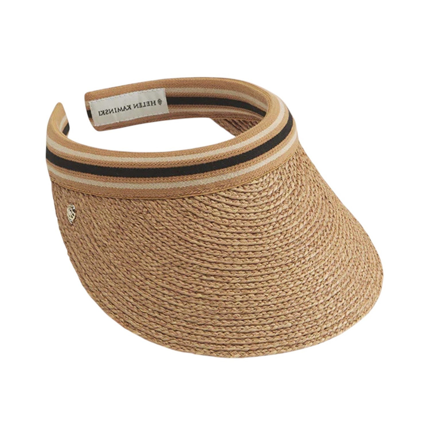 Helen Kaminski Nougat Black Stripe Kirsten Visor. Delightful all year round, Kirsten is crafted from sustainably harvested, hand-braided Madagascan raffia. The style features a 12cm peak, inner neoprene band and size adjustable elastic fastening. Rollable and designed with a securing hook, Kirsten makes for the perfect casual off-duty travel or daily walk companion.