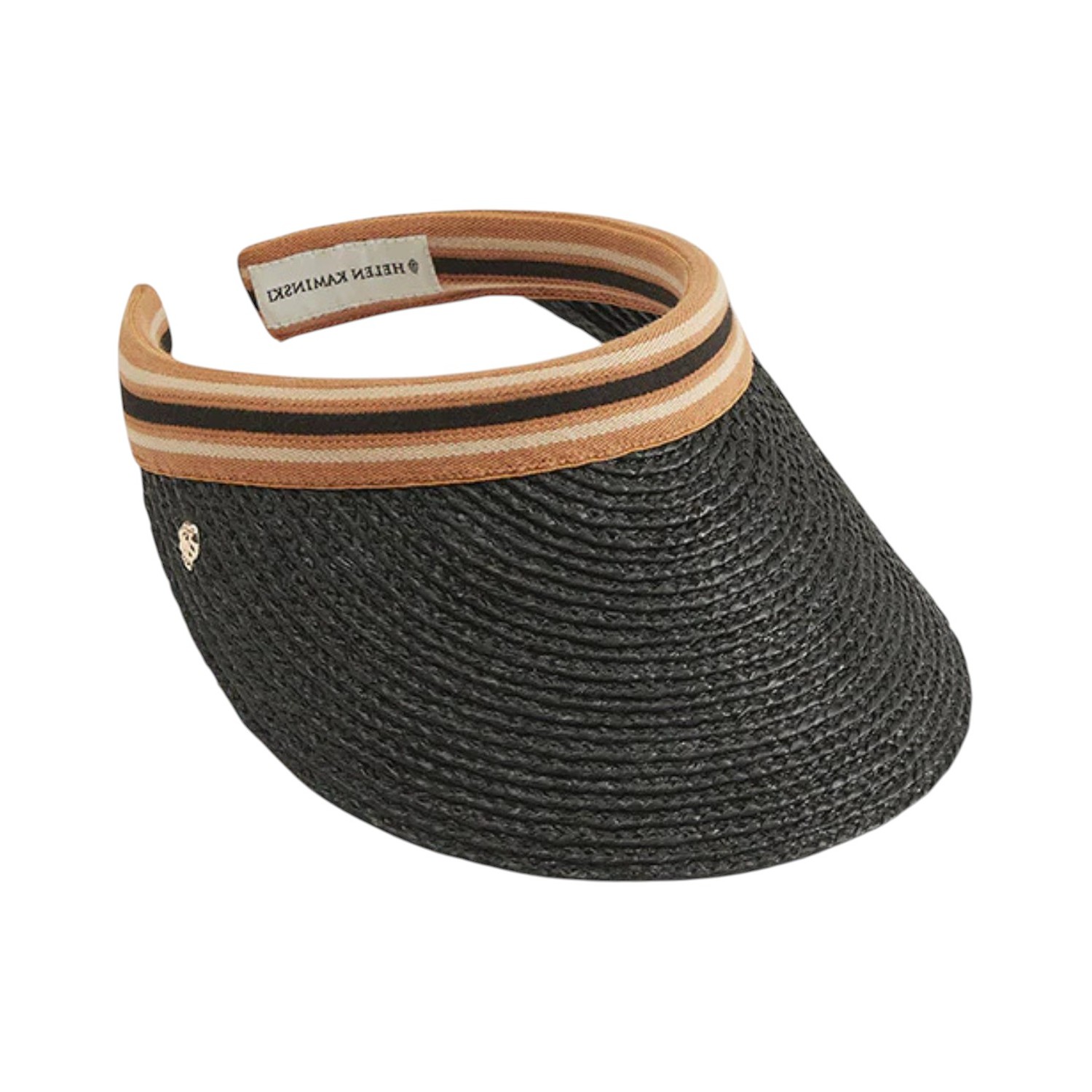 Helen Kaminski Charcoal and Black Stripe Kirsten Visor. Delightful all year round, Kirsten is crafted from sustainably harvested, hand-braided Madagascan raffia. The style features a 12cm peak, inner neoprene band and size adjustable elastic fastening. Rollable and designed with a securing hook, Kirsten makes for the perfect casual off-duty travel or daily walk companion.