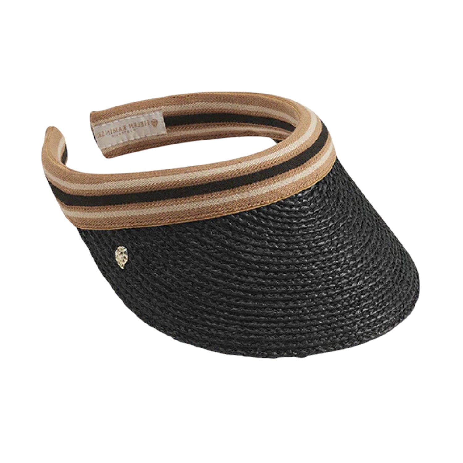 Helen Kaminski Charcoal and Black Bianca 8 Stripe Visor. The Bianca 8 visor offers the sleek sports luxe look with its sharp 8cm brim. Made from our handcrafted raffia braid, this slide-on visor offers classic ease of wear. Available in iconic colours paired with signature stripe elastic band.