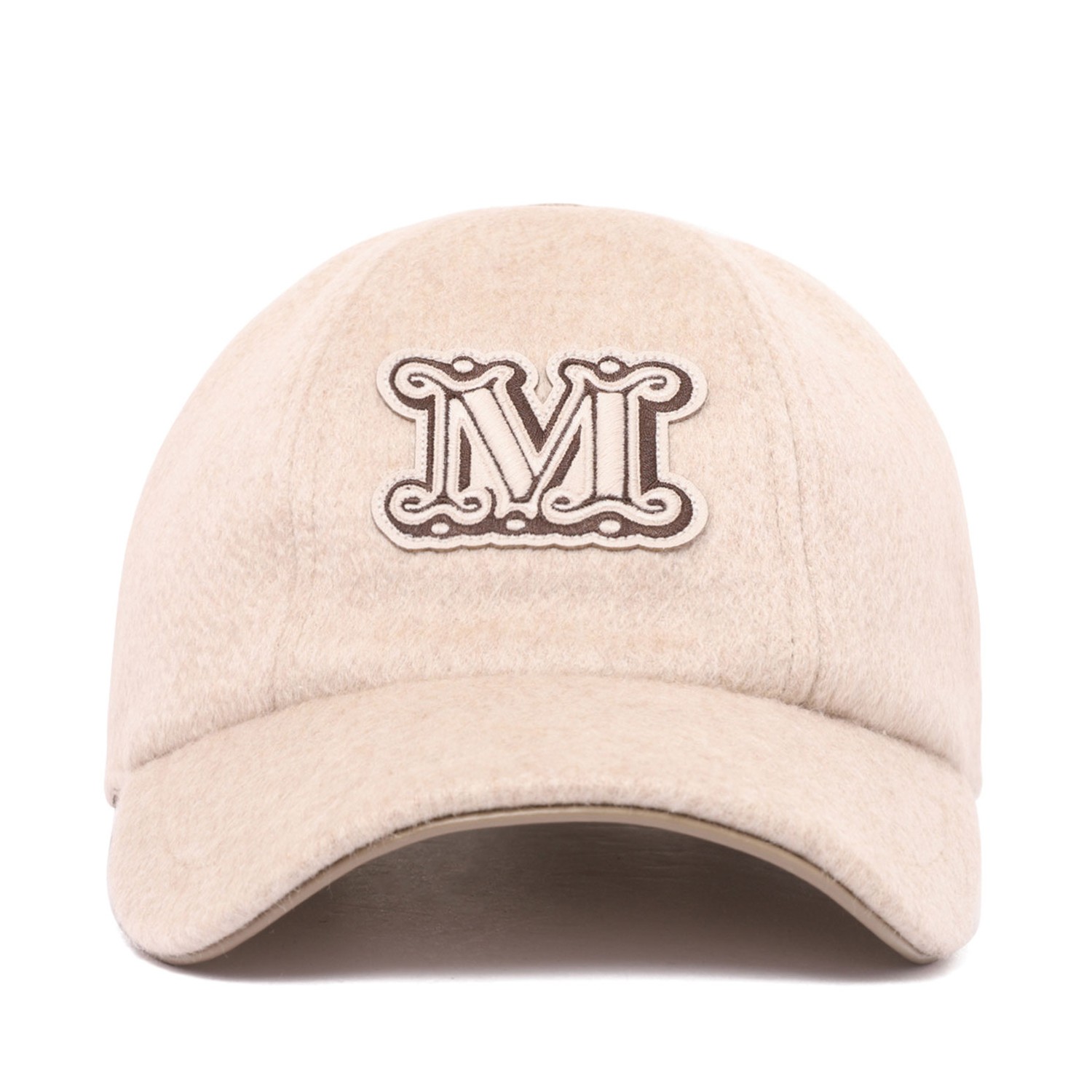 Max Mara Beige Cashmere Baseball Cap. Beige baseball cap with a semi-rigid peak, double-faced sable-look pure cashmere broadcloth. Embroidered M monogram logo on the front, metal buckle-adjustable strap at the back.